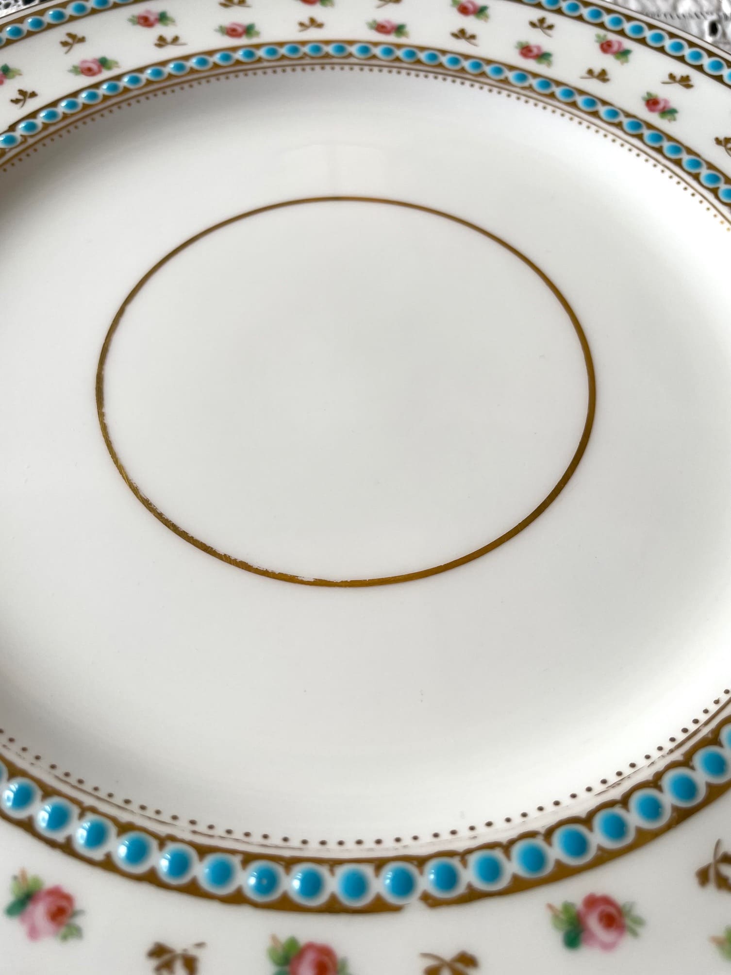 プレートの縁には可愛らしいミニローズが描かれており、その周りを「ミントンブルー」とも称される鮮やかなターコイズブルーのドットが彩ります✽.。.:*