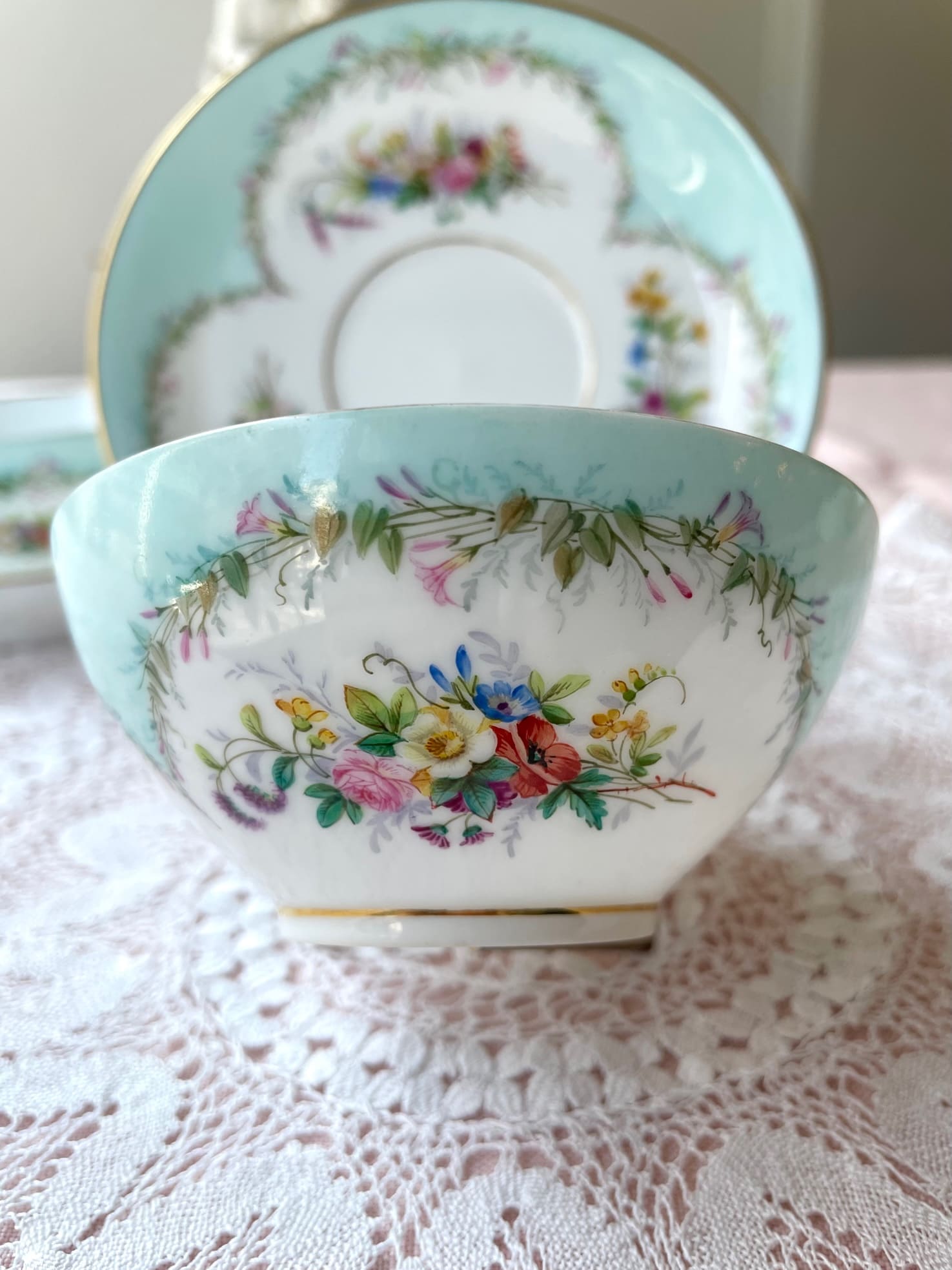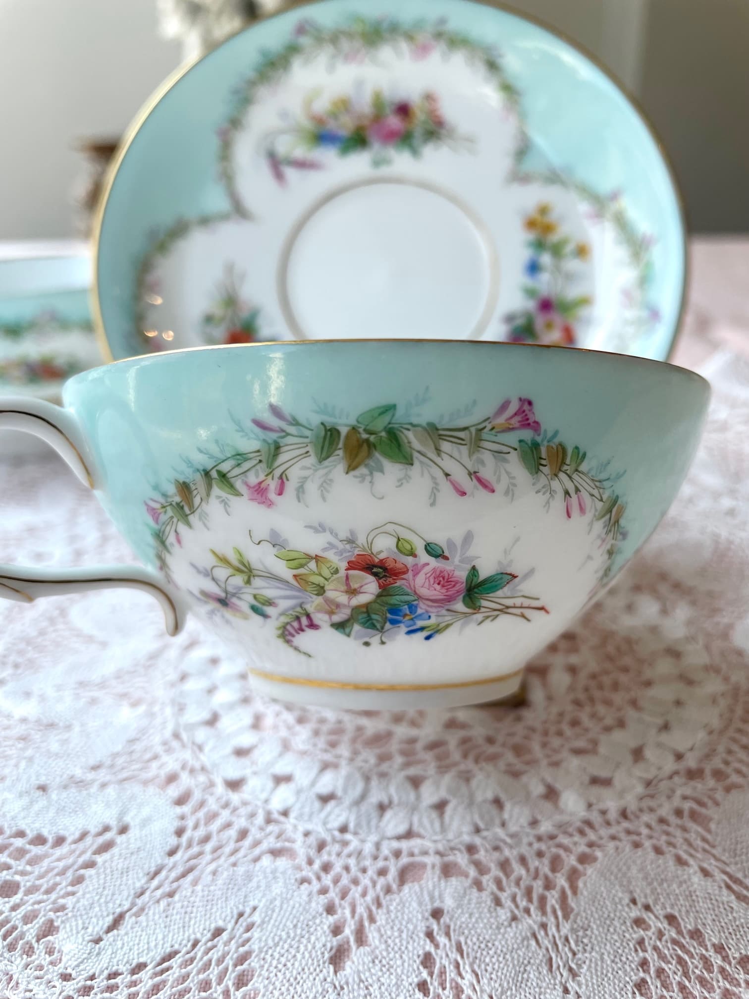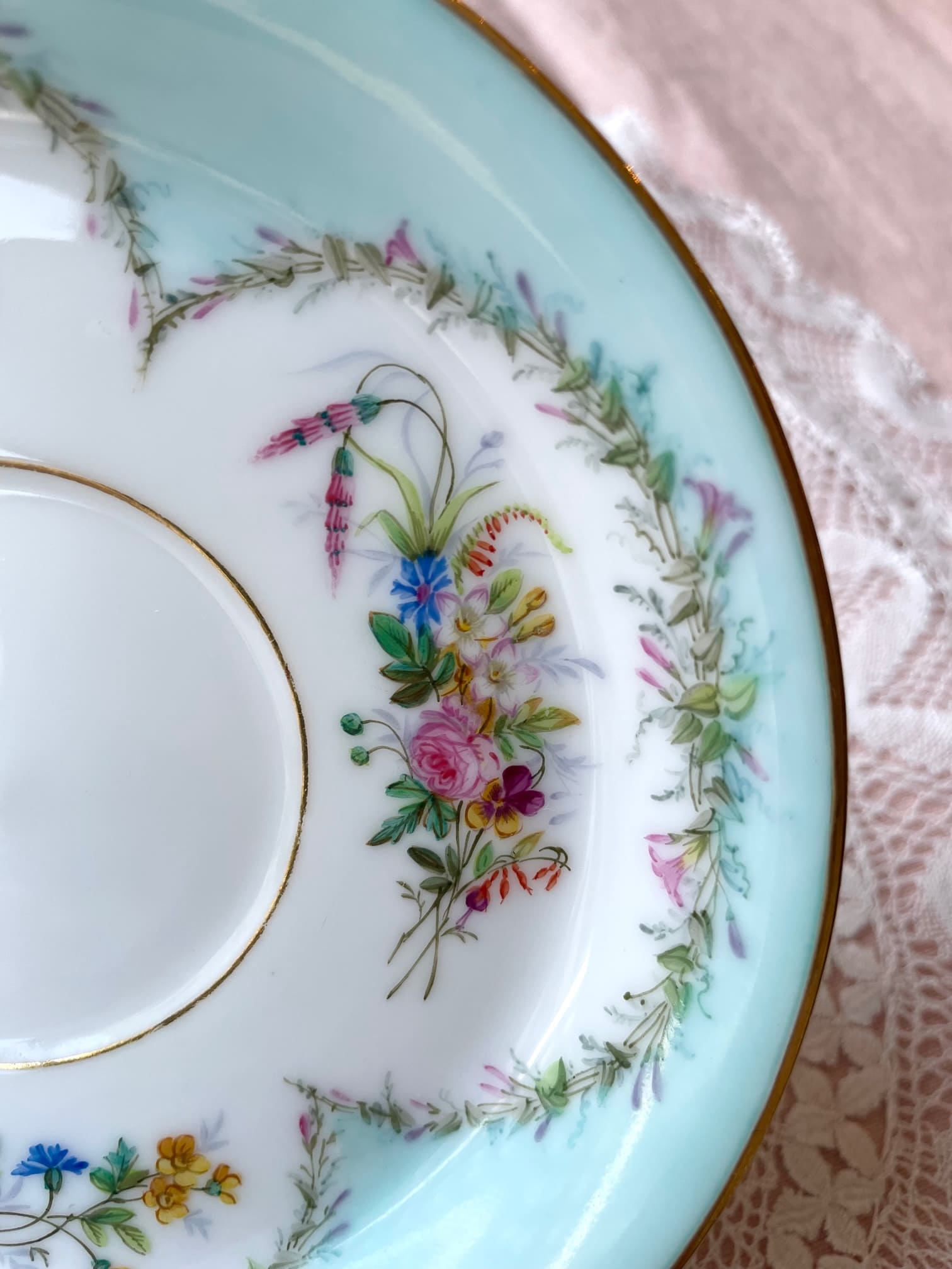 爽やかなミントグリーンのお色味、繊細なブーケは、全てハンドペイントで装飾されております✧˖°