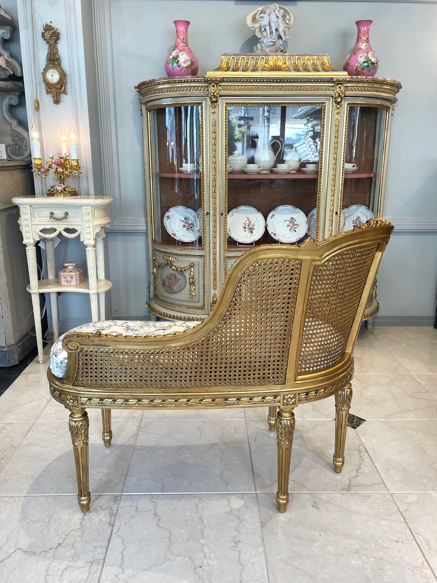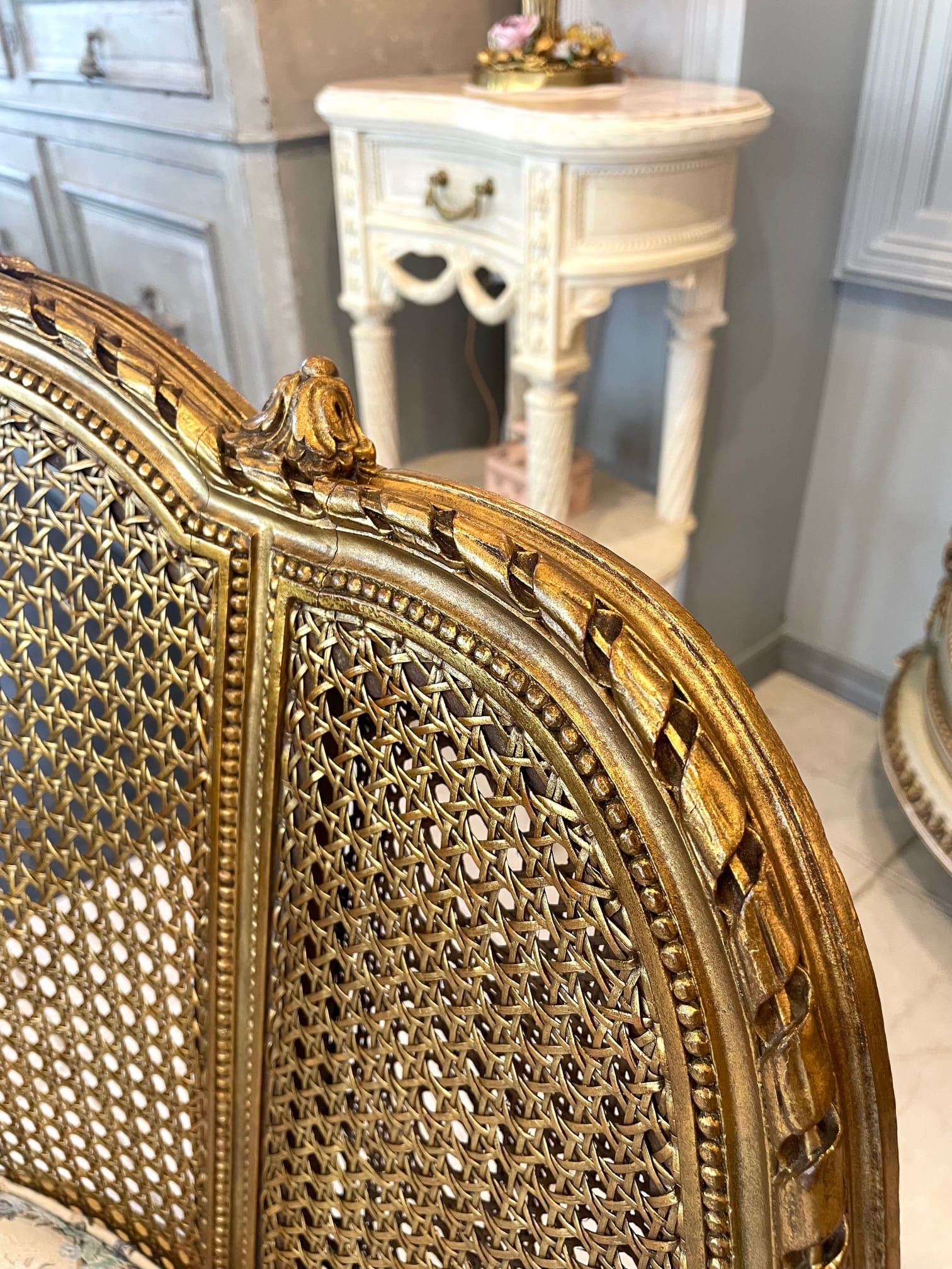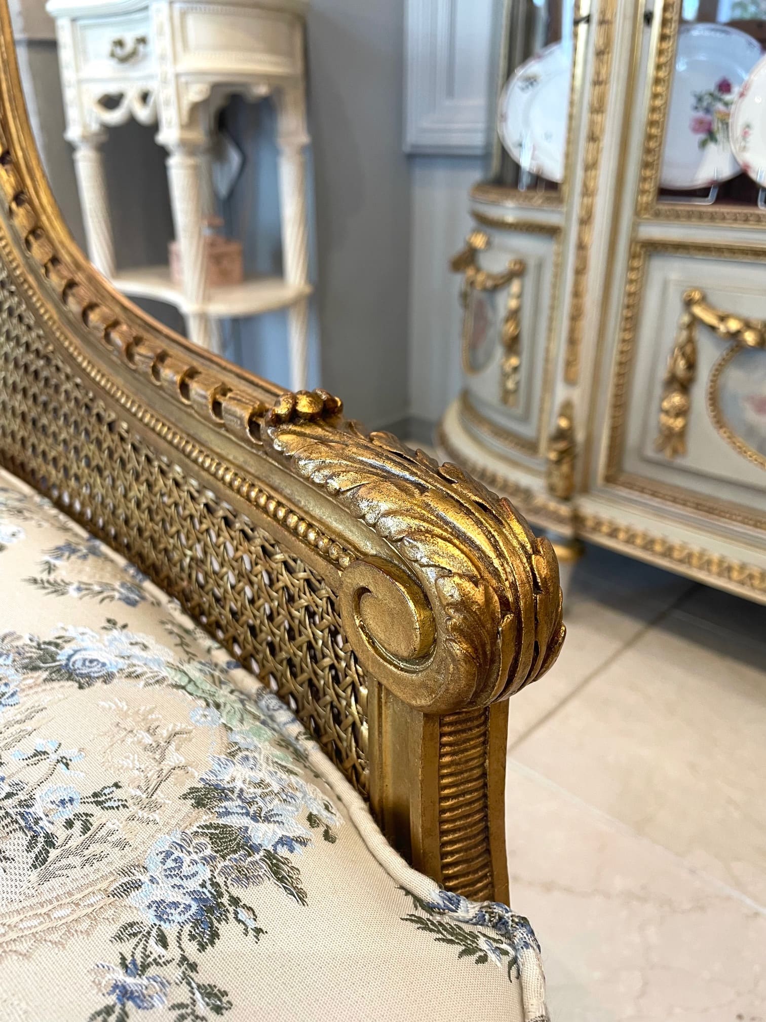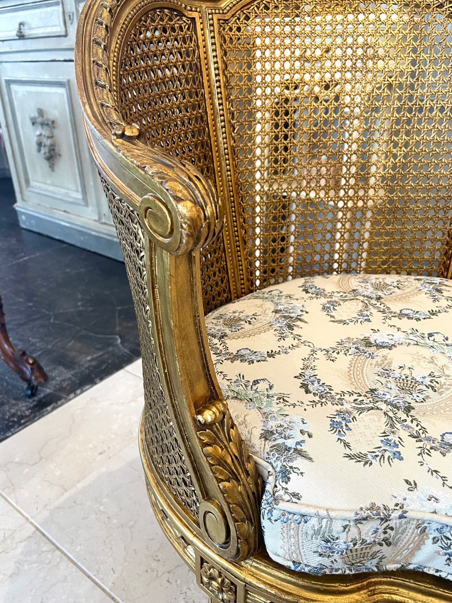 ローズ、カーリングリボン、アカンサスの繊細な彫刻に合わせ、クッションシートは人気のパニエドフルールのファブリックであつらえました♡