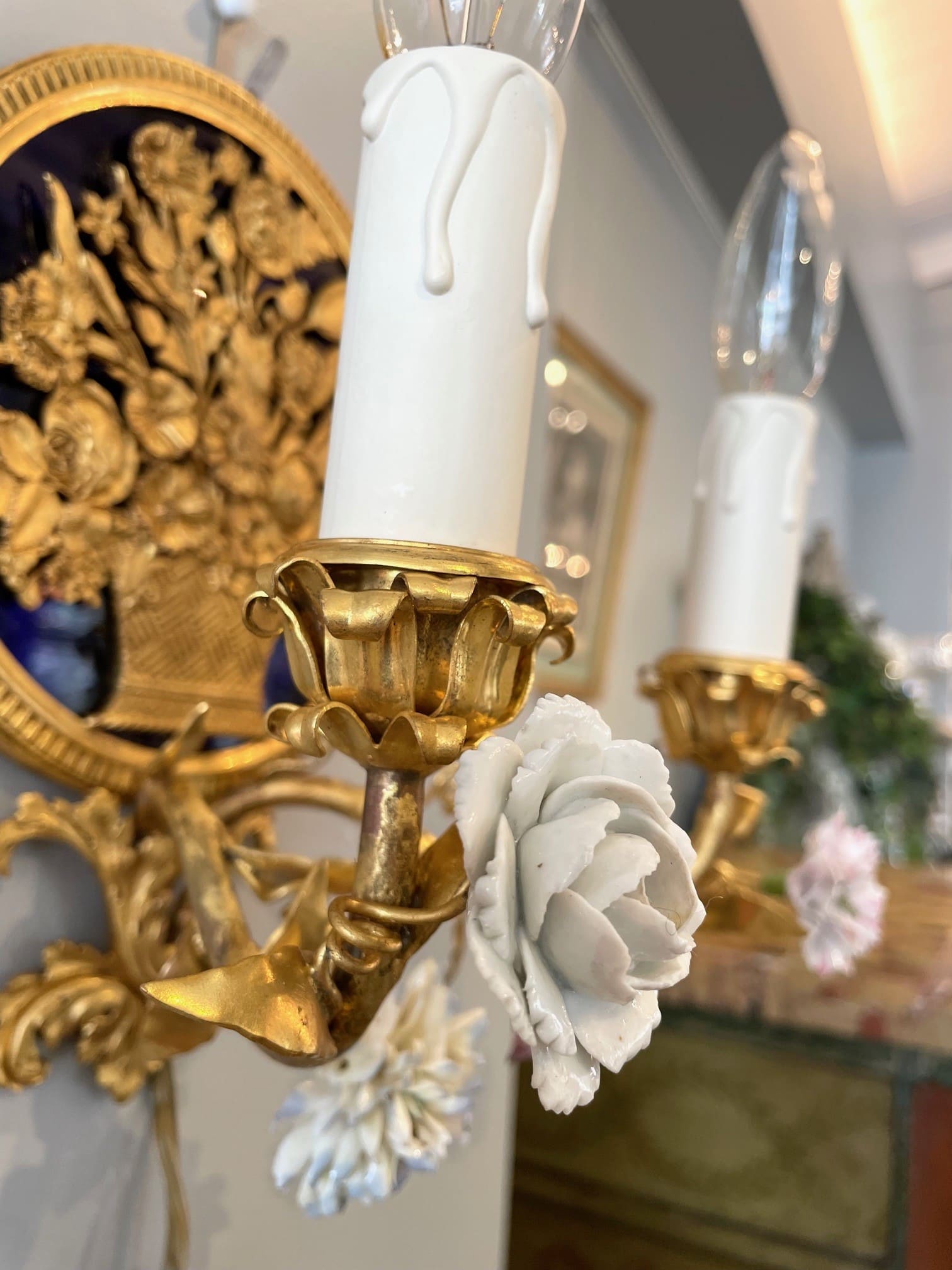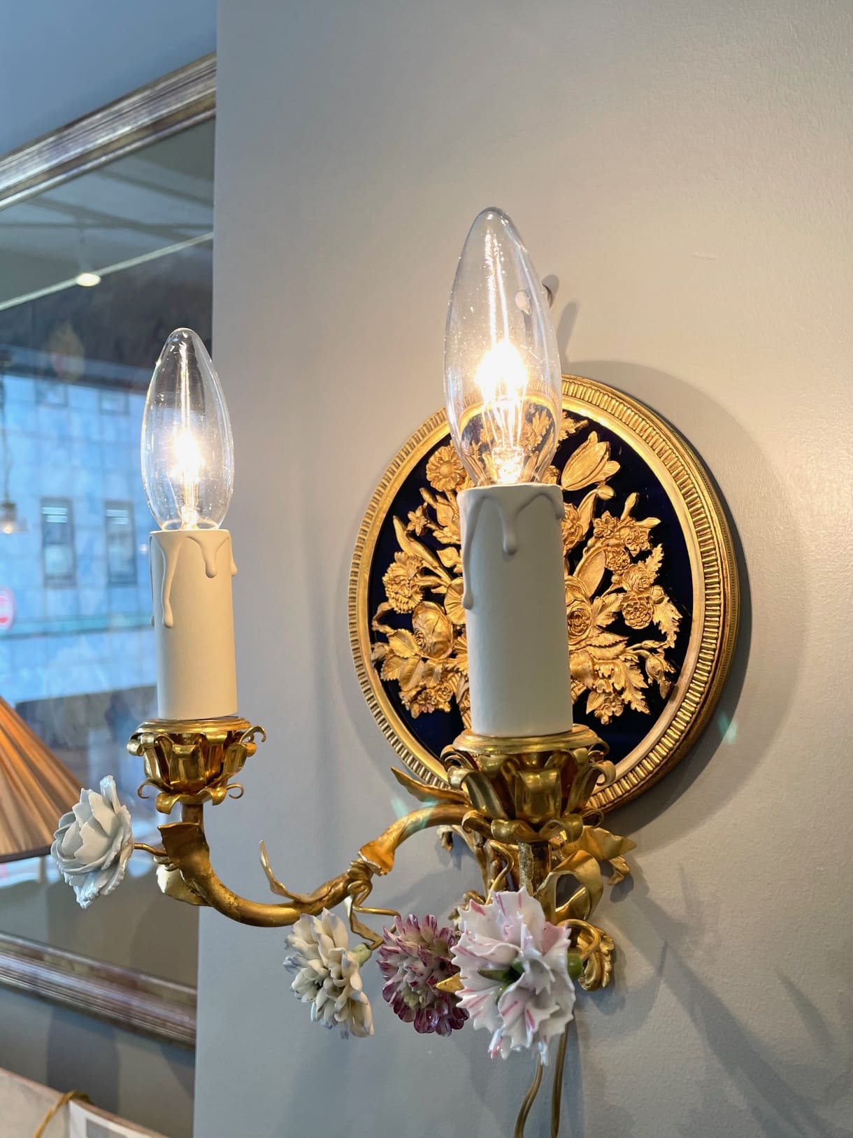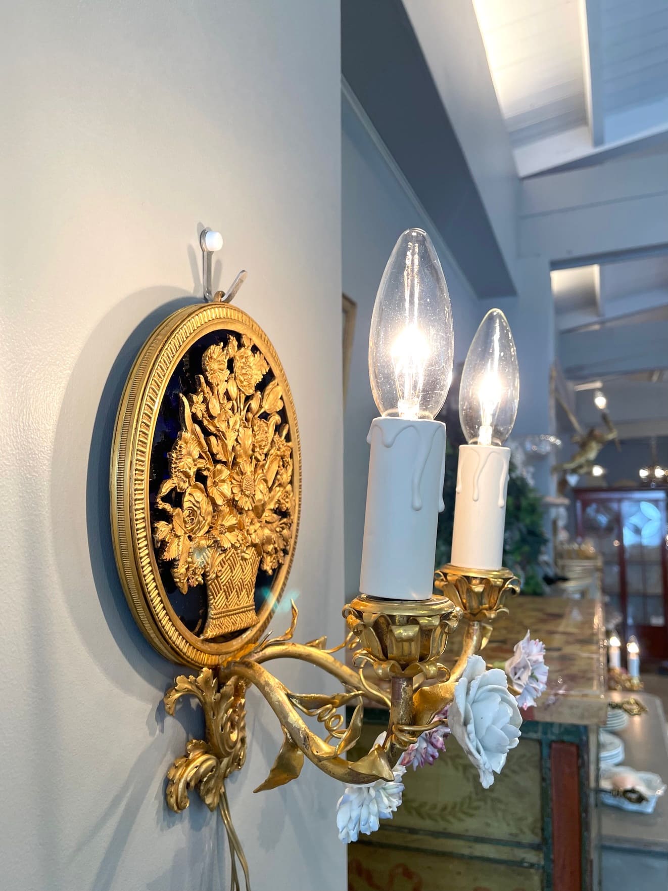 パニエ・ド・フルールの繊細なブロンズの装飾が目を引く素敵なウォールランプ・*:.。❁