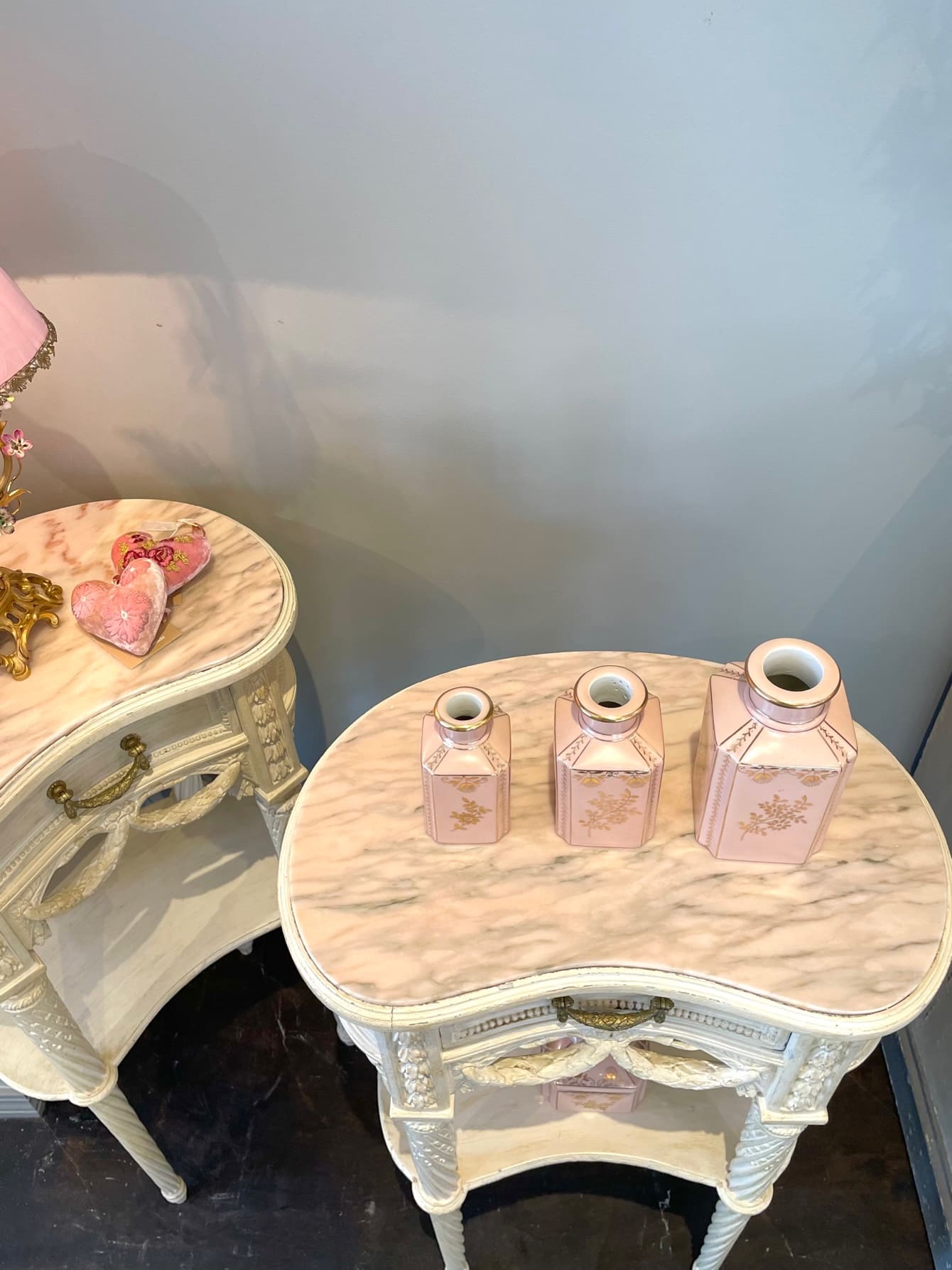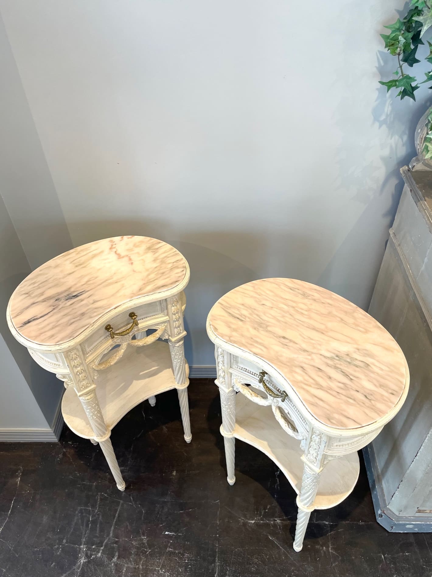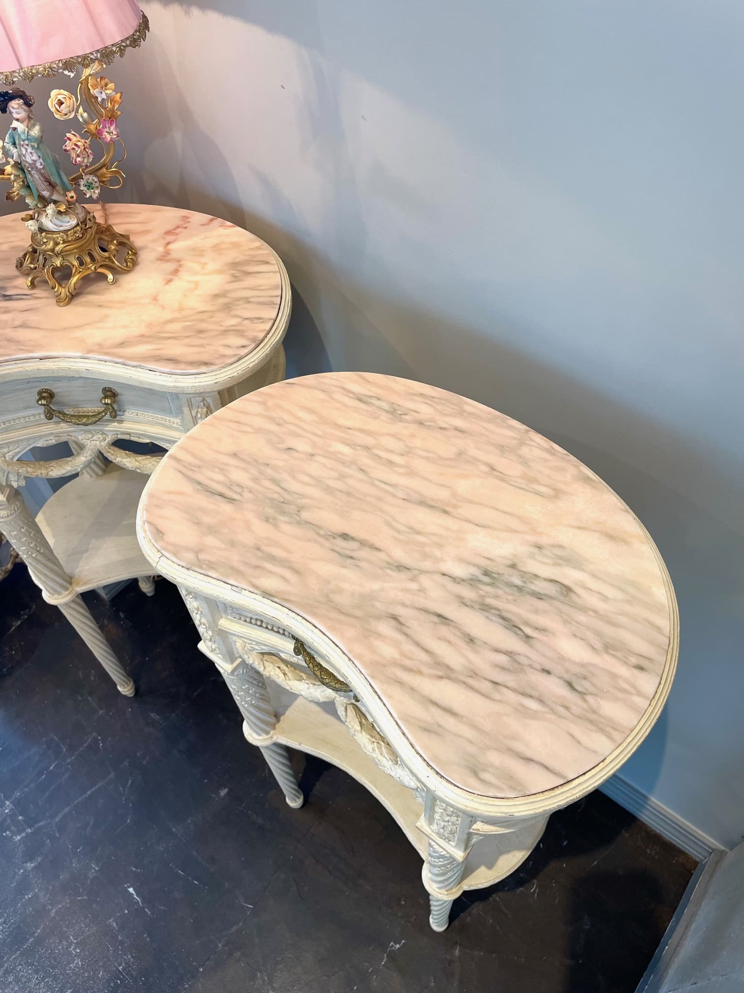 柔らかでぽってりとしたオリジナルの白色ペイントと、淡くピンクがかった天然大理石の組み合わせがお洒落なキドニー型のベッドサイド✧*
