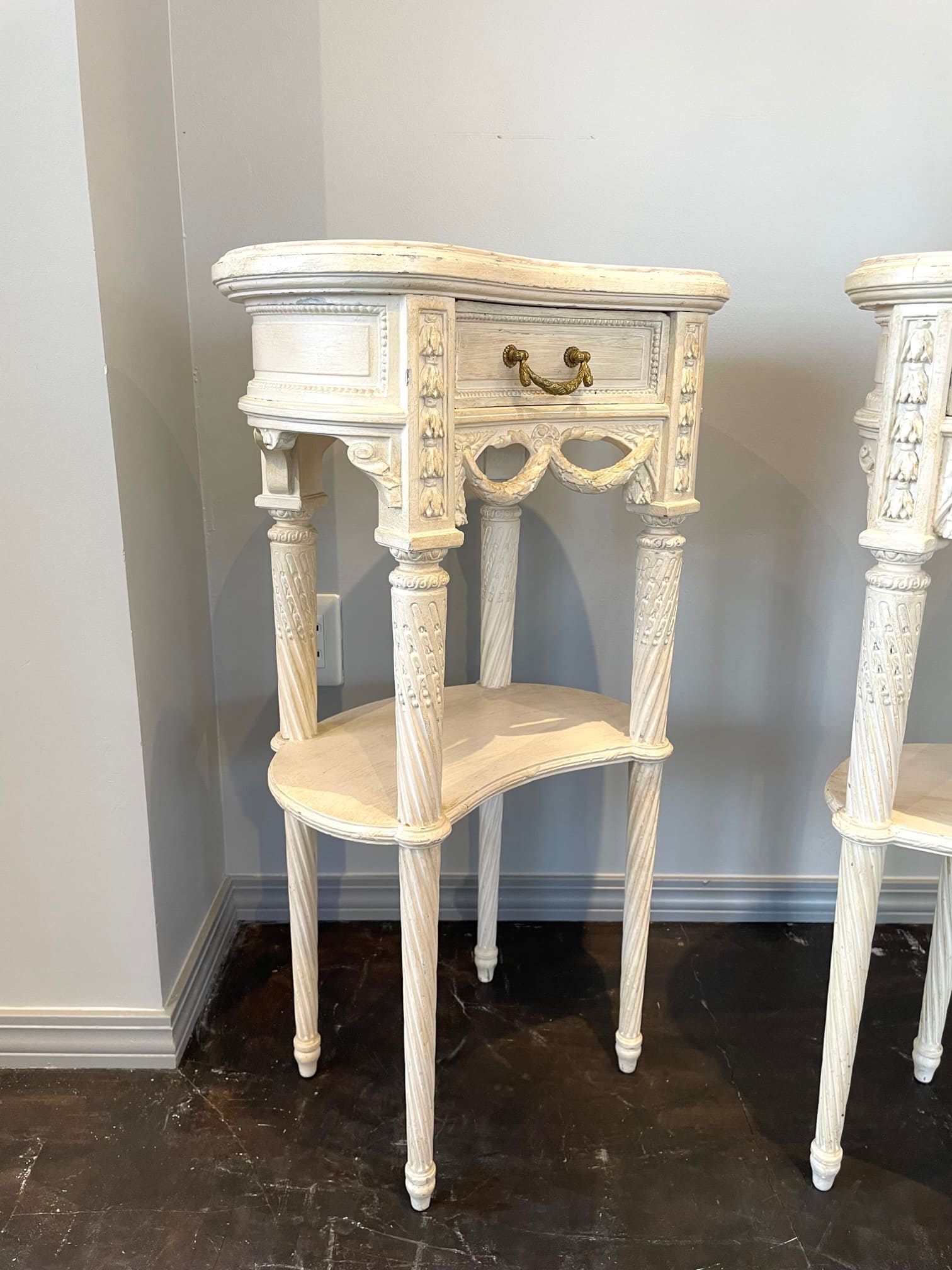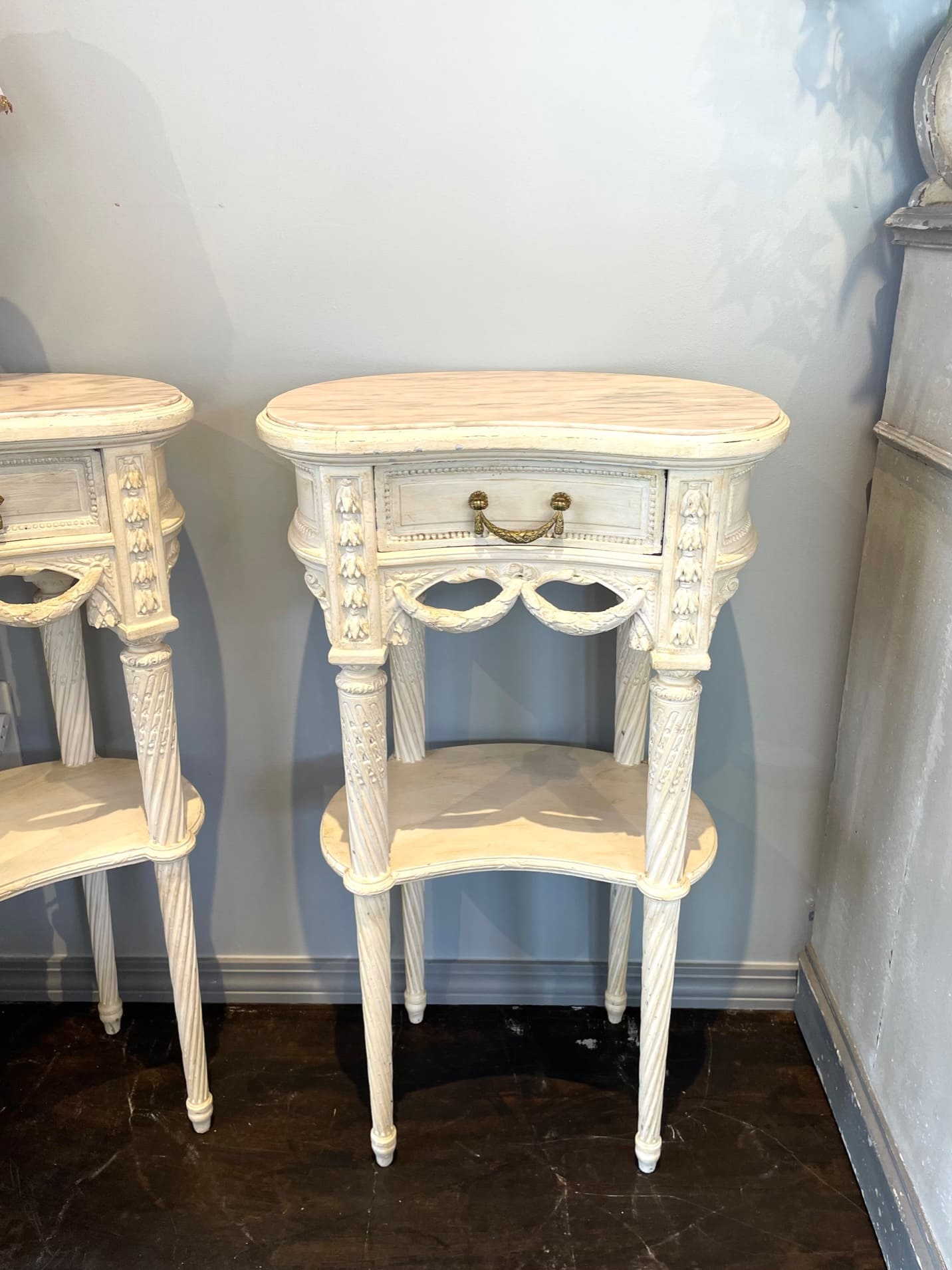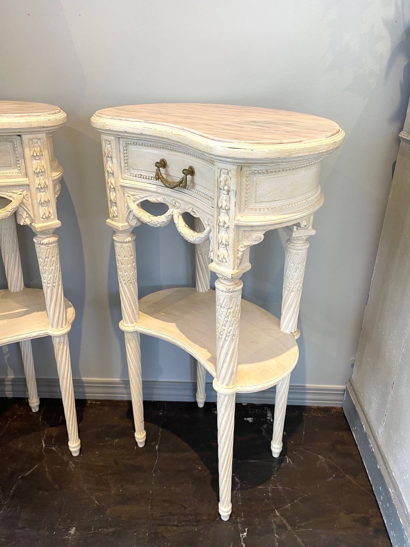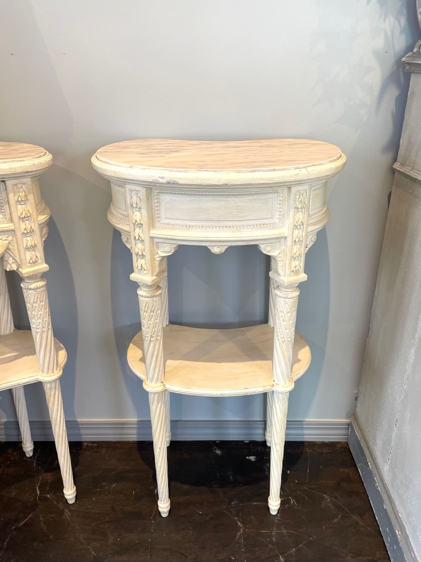 柔らかでぽってりとしたオリジナルの白色ペイントと、淡くピンクがかった天然大理石の組み合わせがお洒落なキドニー型のベッドサイド✧*
