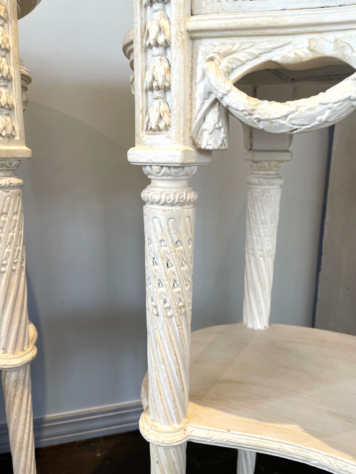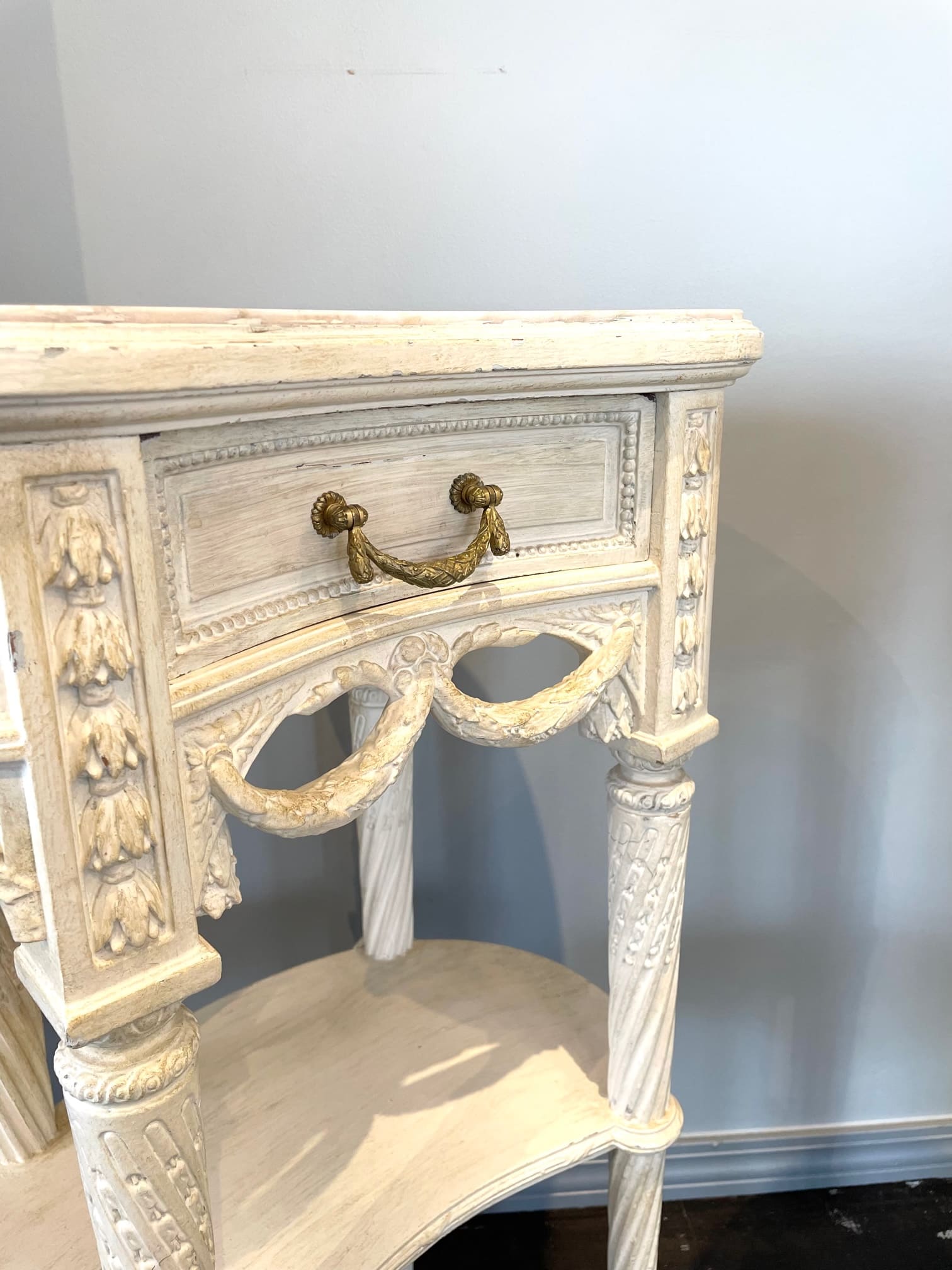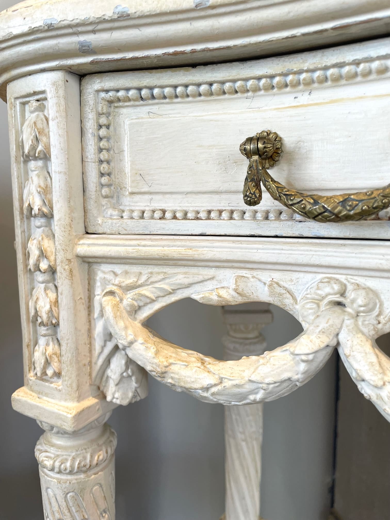 立体的な月桂樹のガーランドの彫刻に合わせ、同じデザインで作られた引き出しの取っ手にも拘りを感じます。