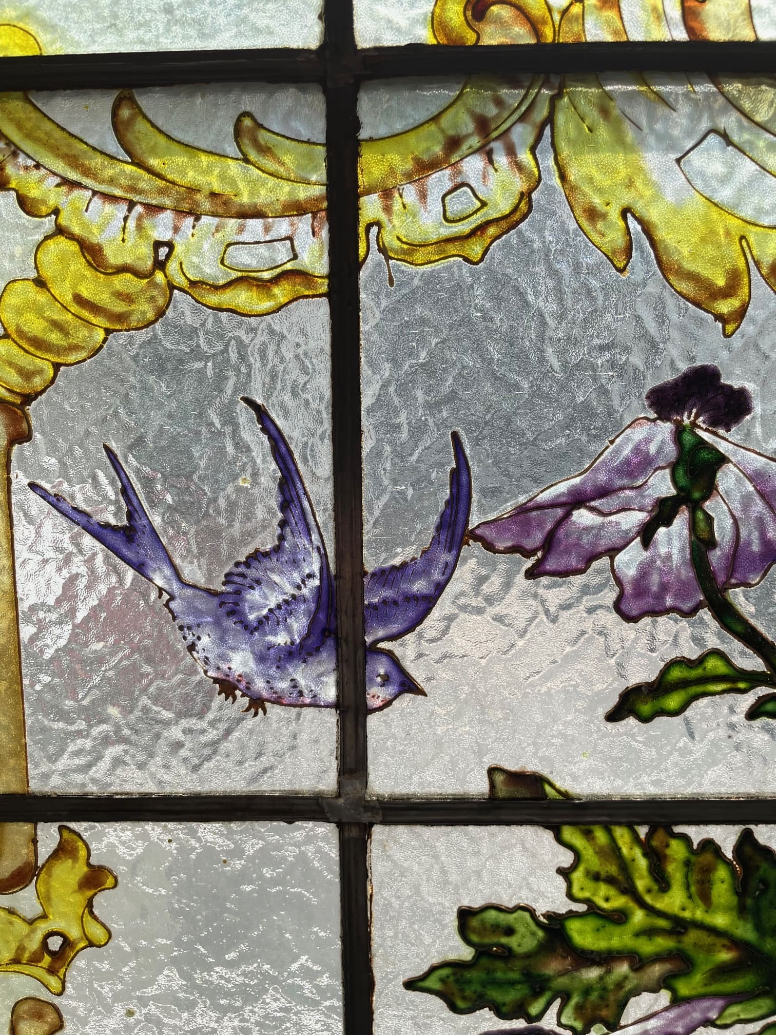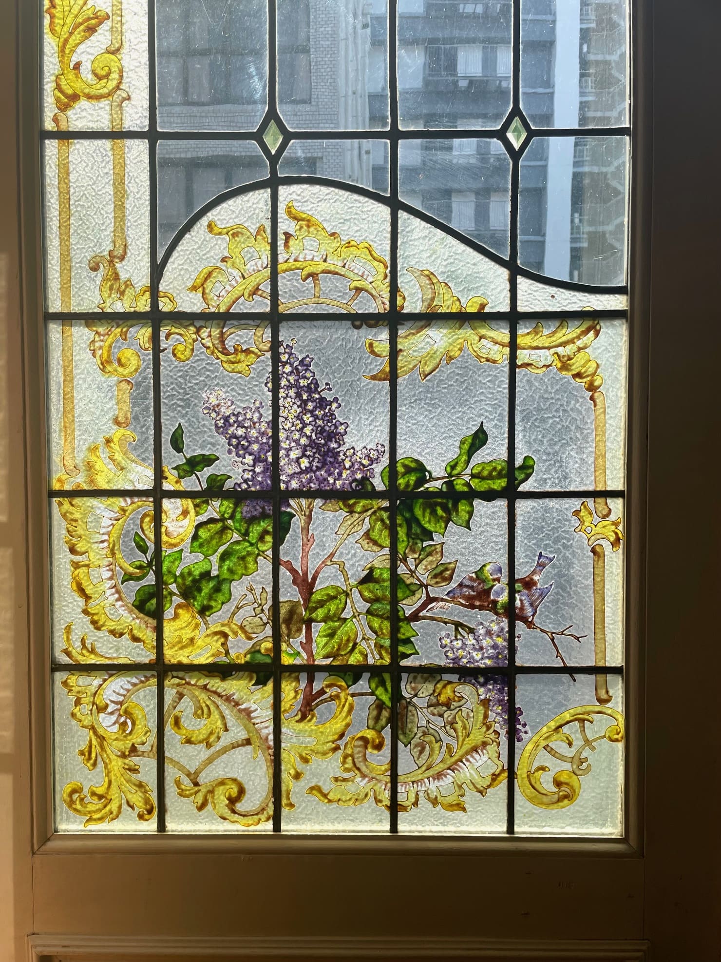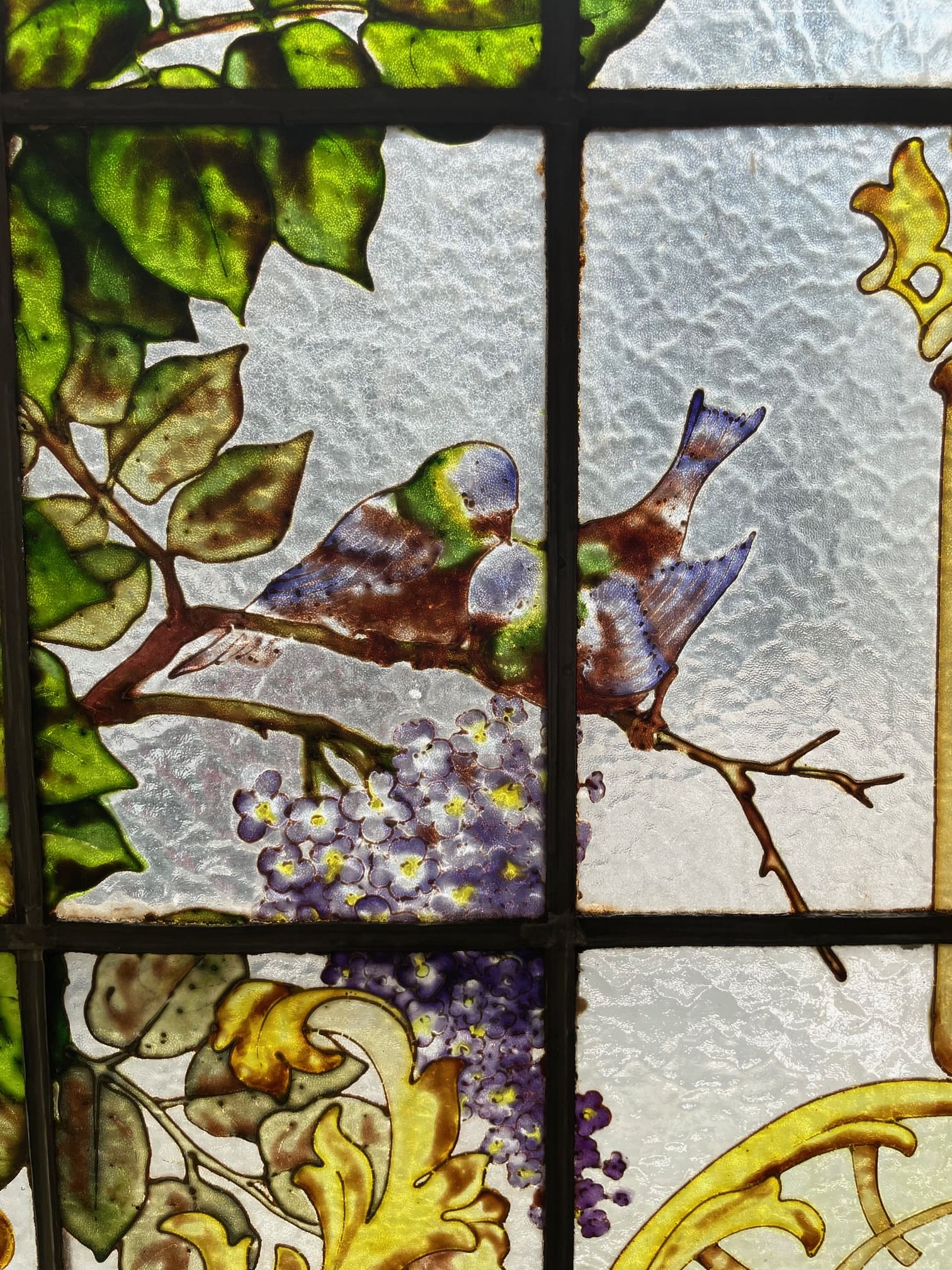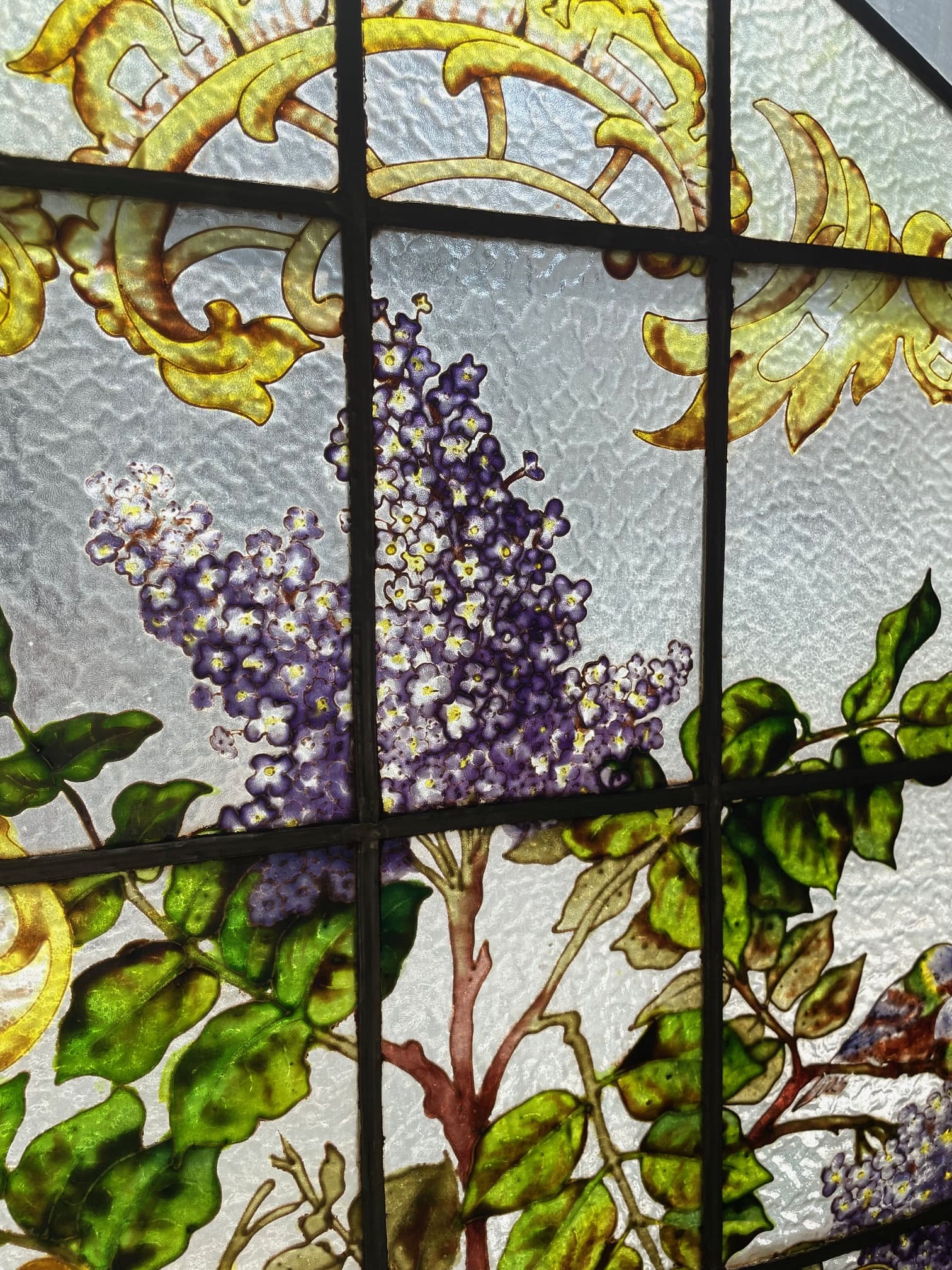 ライラック、ローズ、アネモネ、小鳥がエナメルで描かれた美しい3枚綴りのステンドグラス.。❁