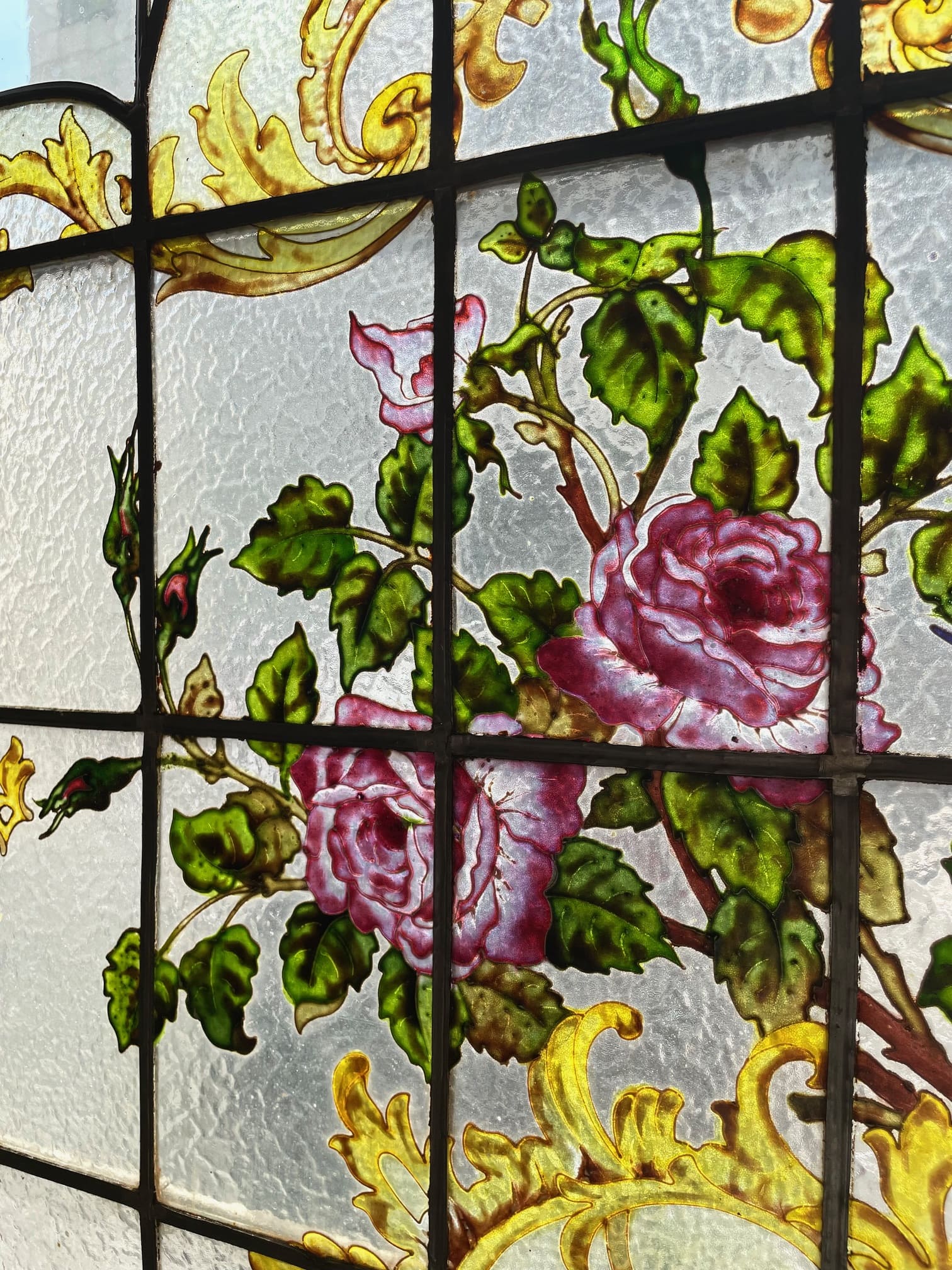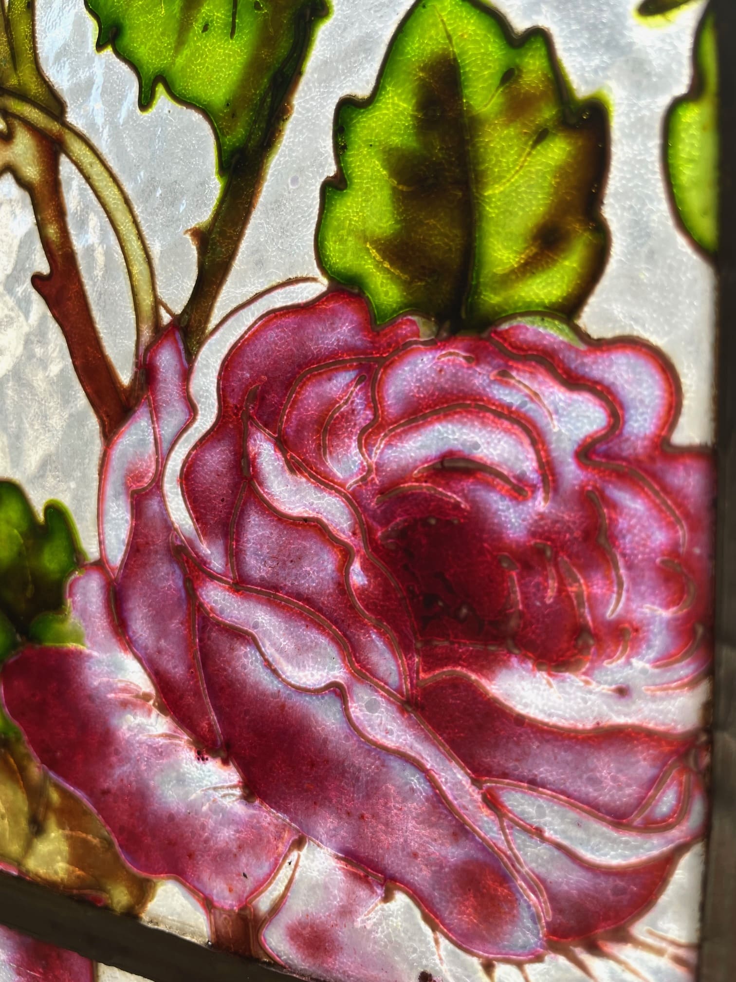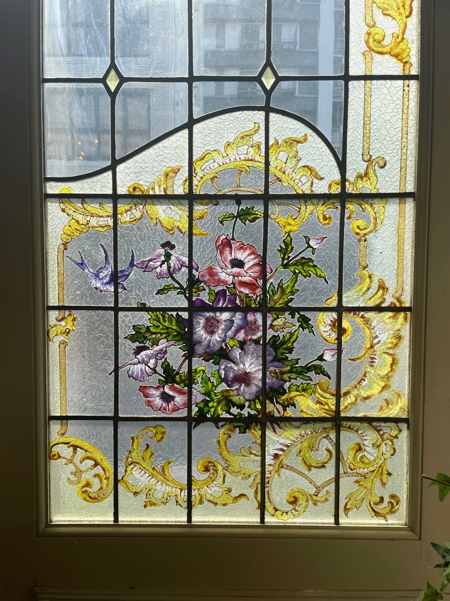 ライラック、ローズ、アネモネ、小鳥がエナメルで描かれた美しい3枚綴りのステンドグラス.。❁