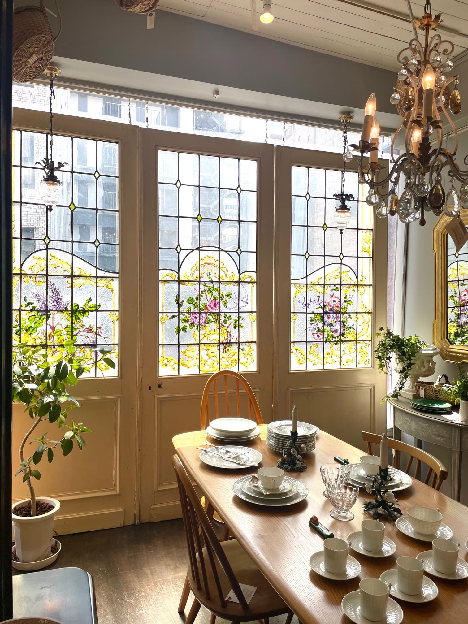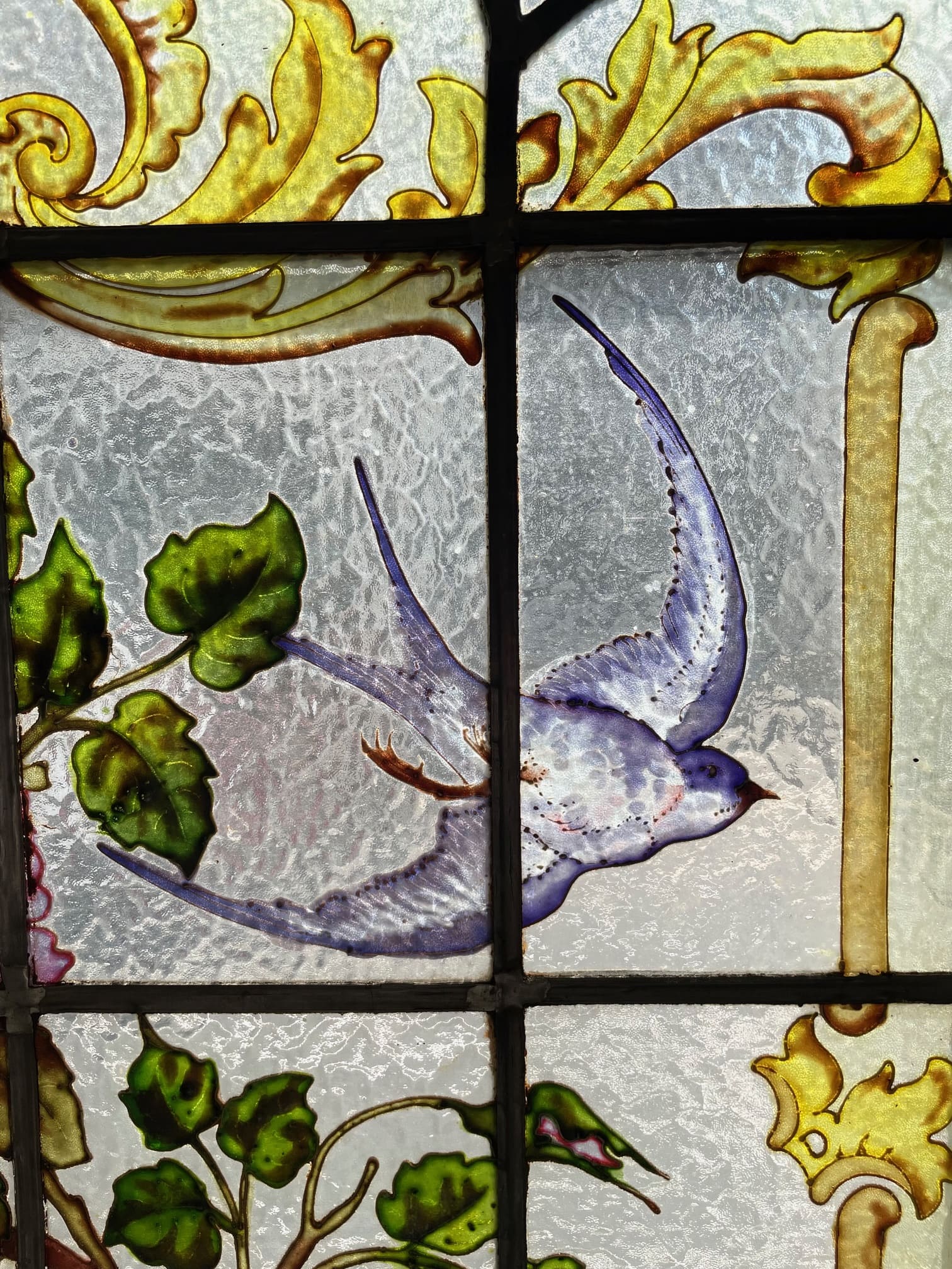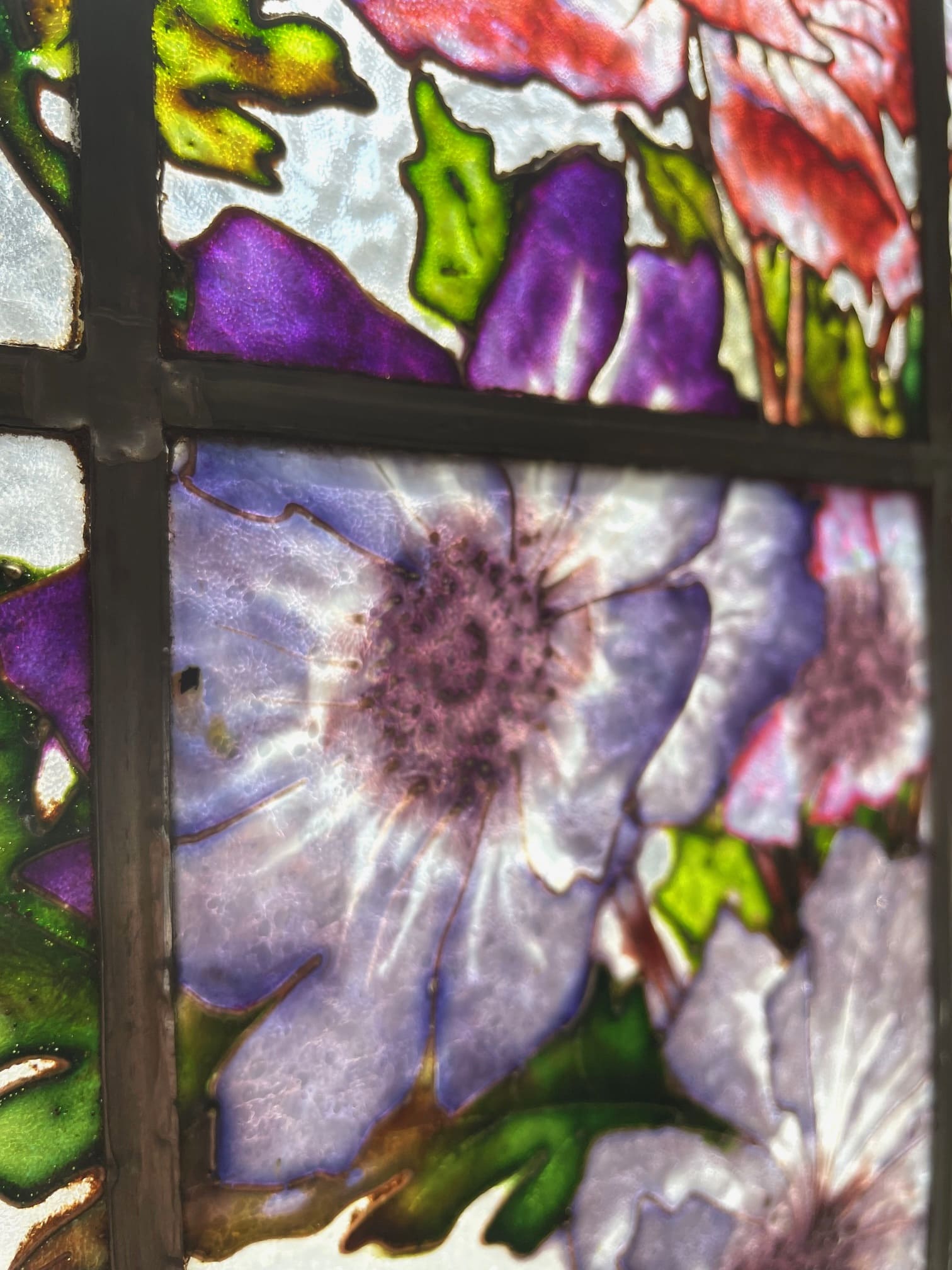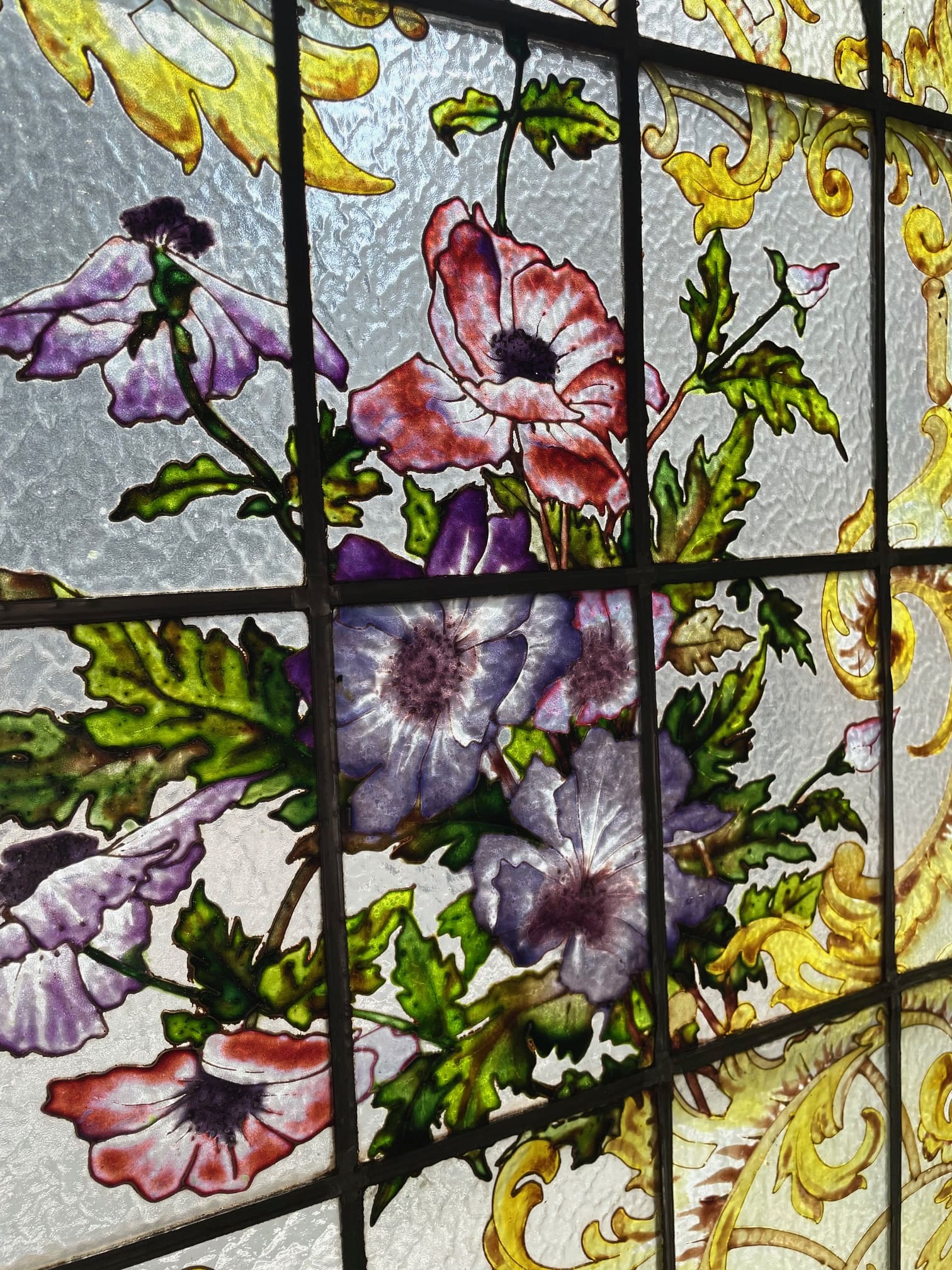 ライラック、ローズ、アネモネ、小鳥がエナメルで描かれた美しい3枚綴りのステンドグラス.。❁