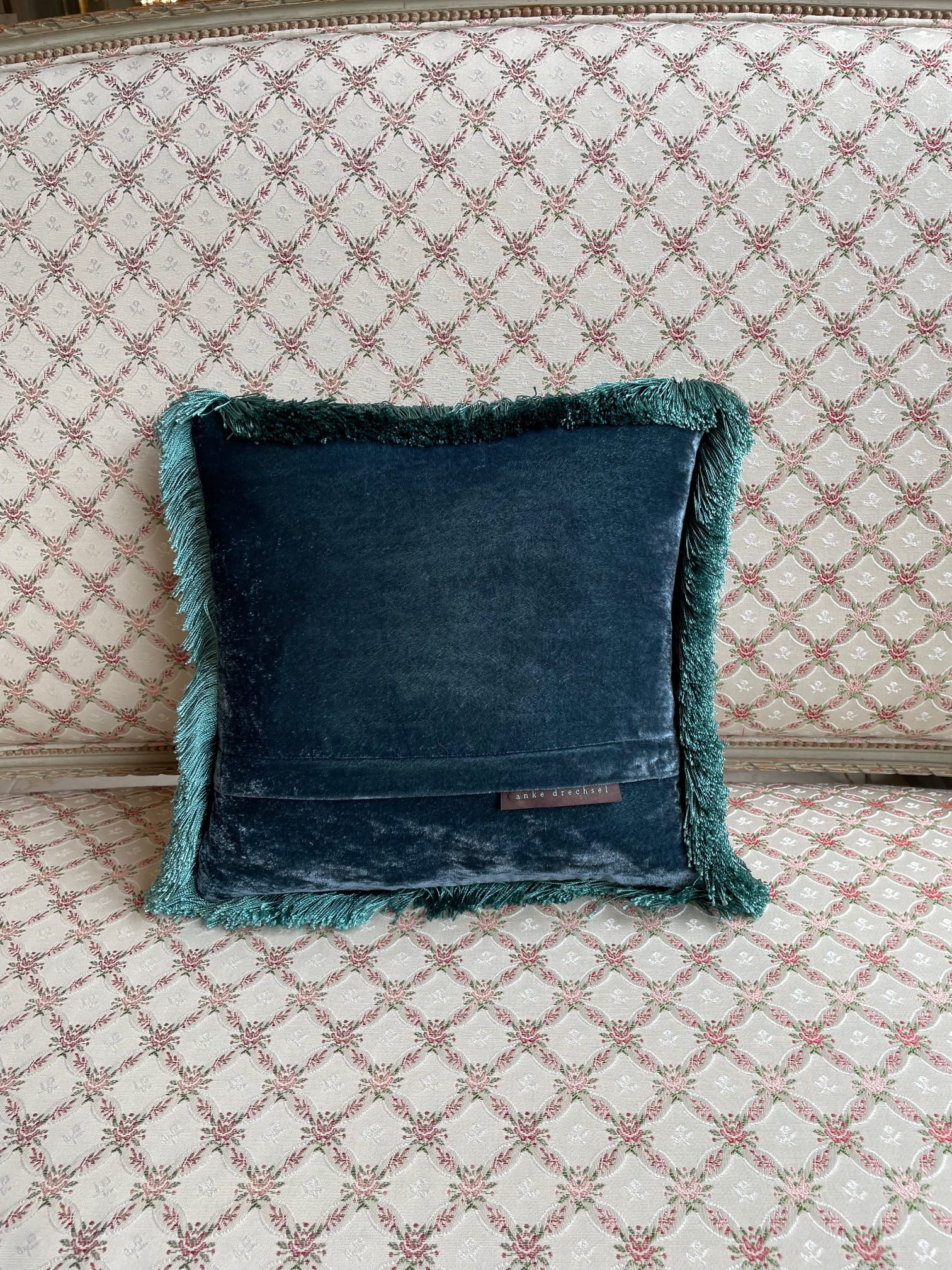 艶やかなシルクヴェルヴェットの光沢と、ハンドメイドの刺繍が美しいクッションです。