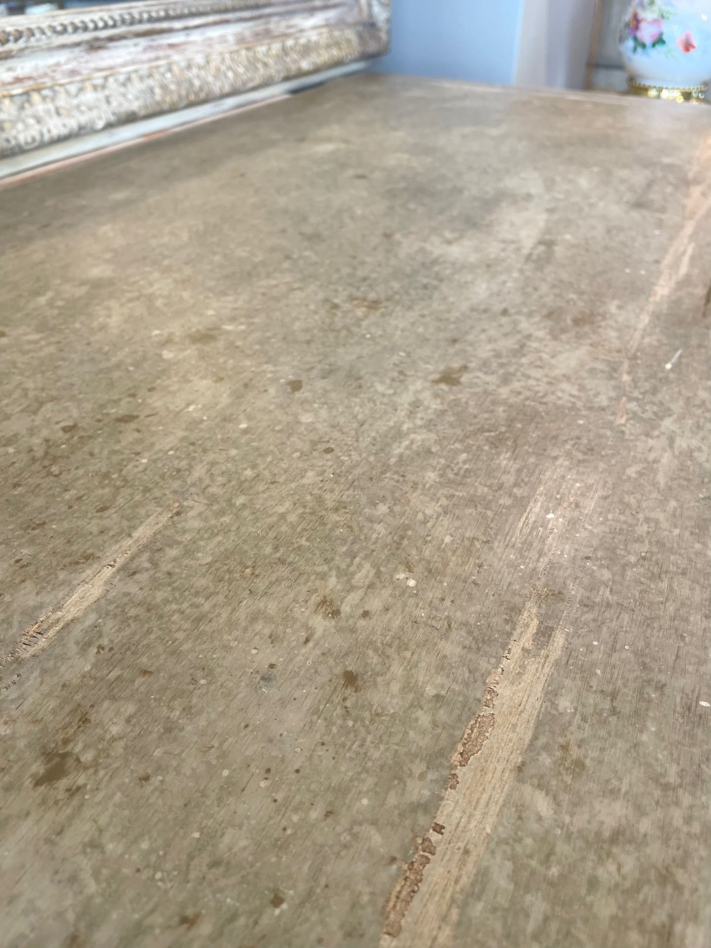 白いペイントのフレームに、ブルーグレーのラインが映え、フレンチグレーの天板トップは味わい深く雰囲気がございます。