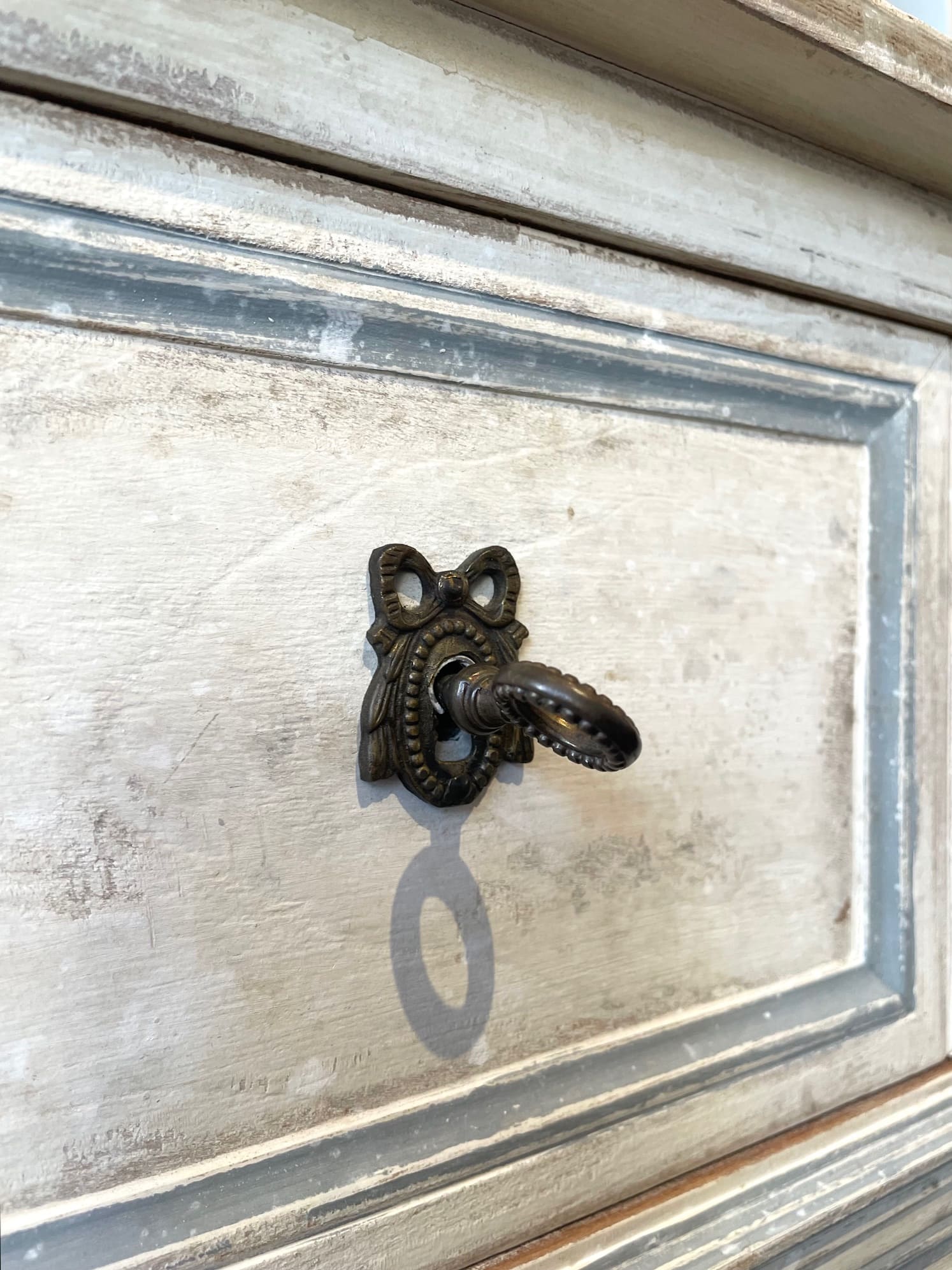 オリジナルの金具が取り付けられた3段ある引き出しのうち一番上の段には鍵が付いており、ロックできます。