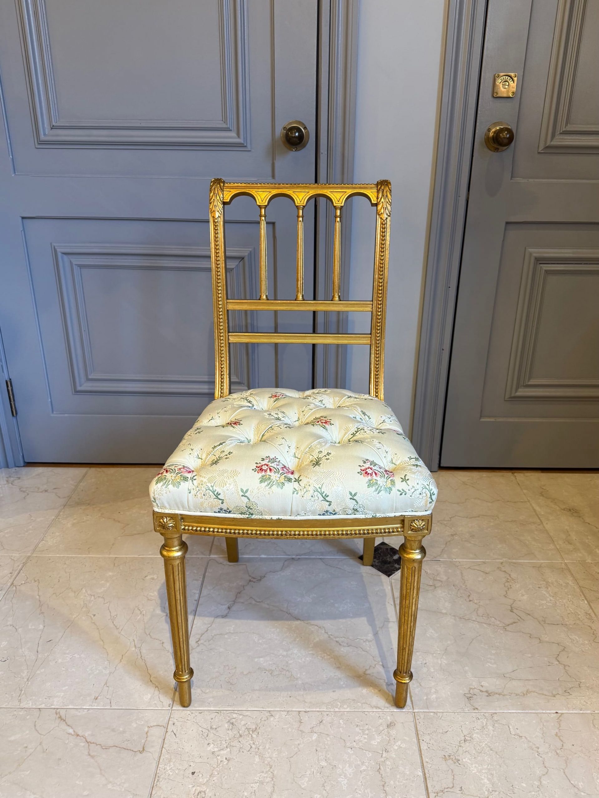 スラッと伸びる脚に少しだけカーブを描いた背もたれのバランスが絶妙にお洒落な、ルイ16世スタイルのサロンチェアが張り上がってまいりました♪