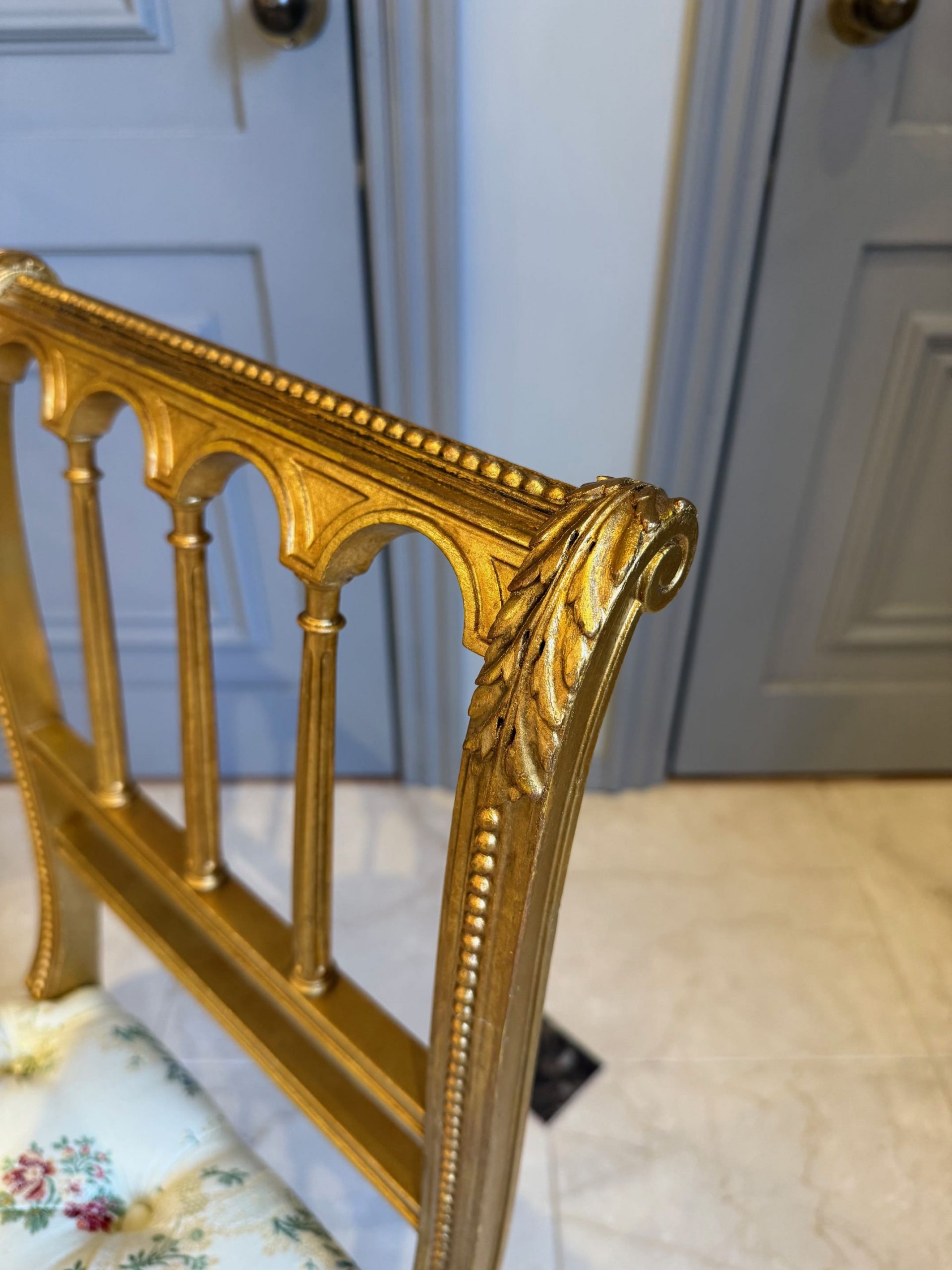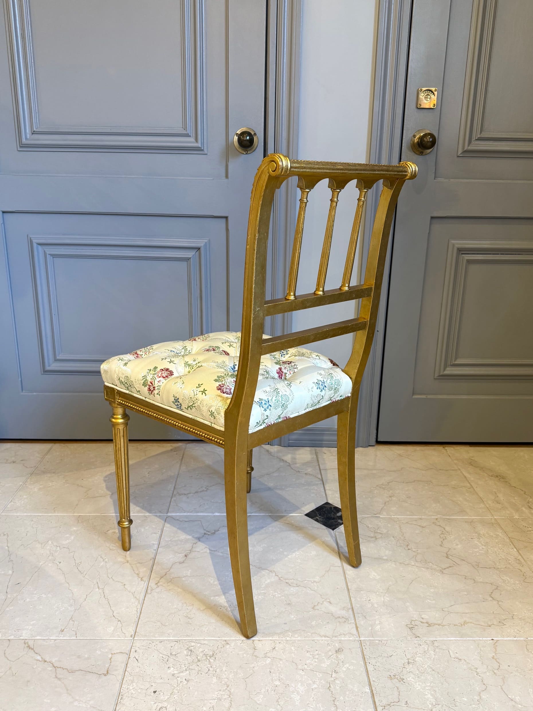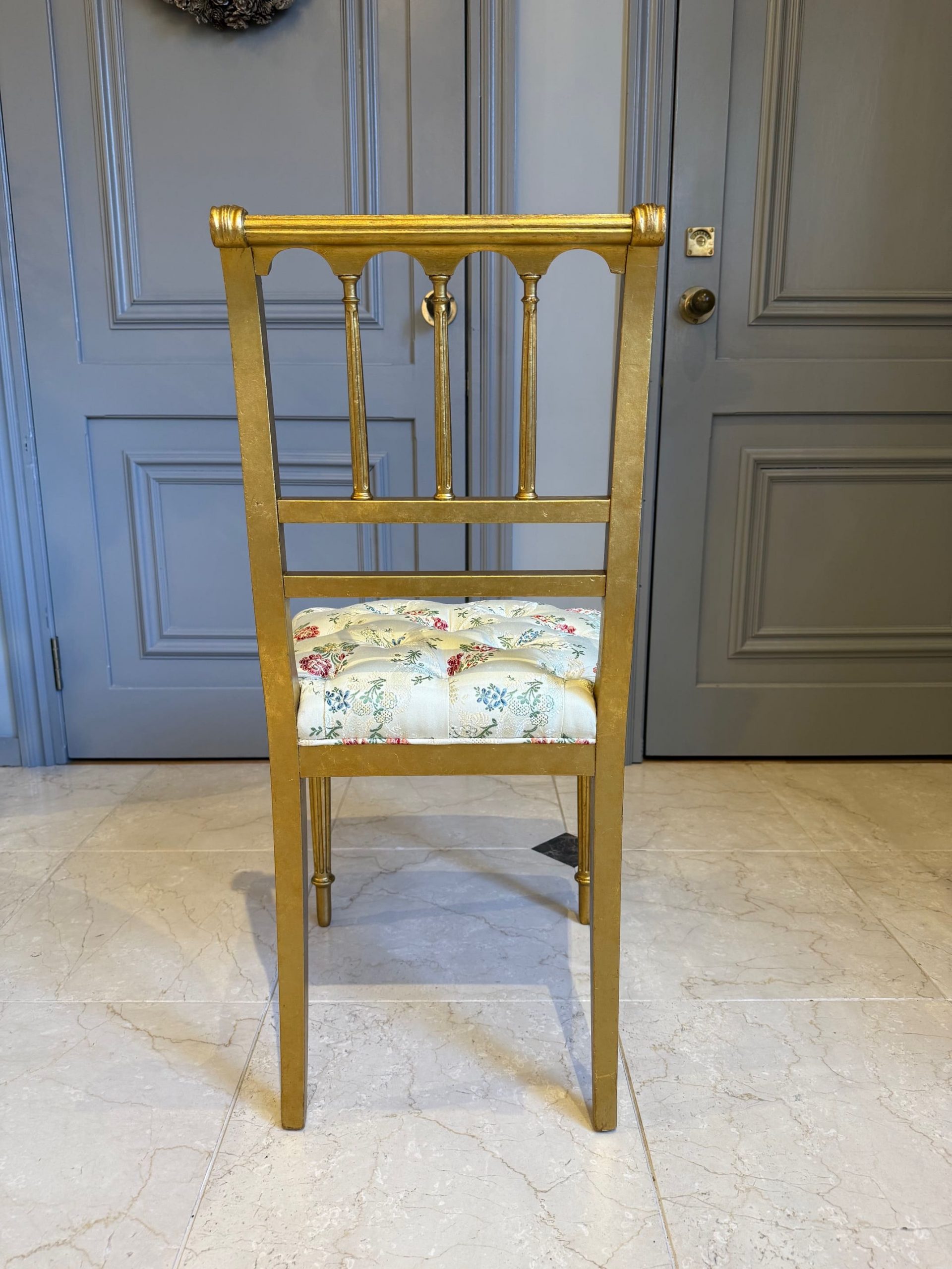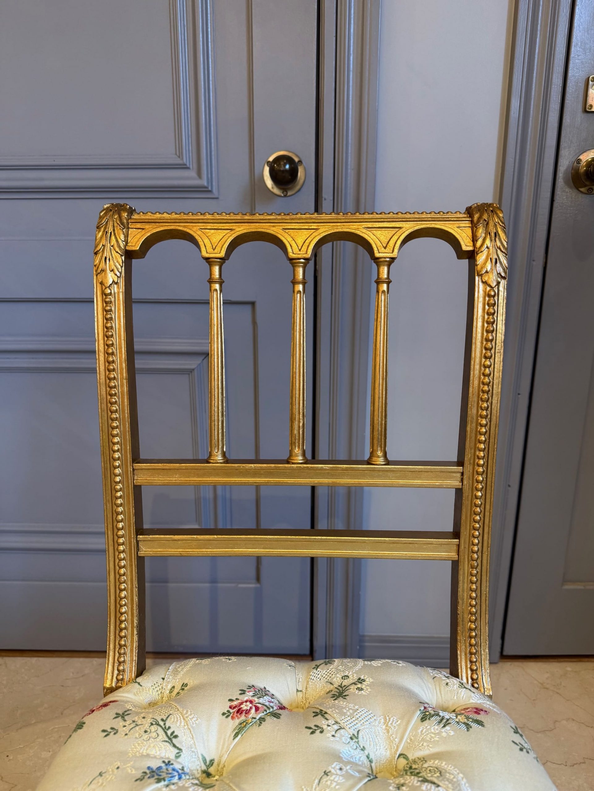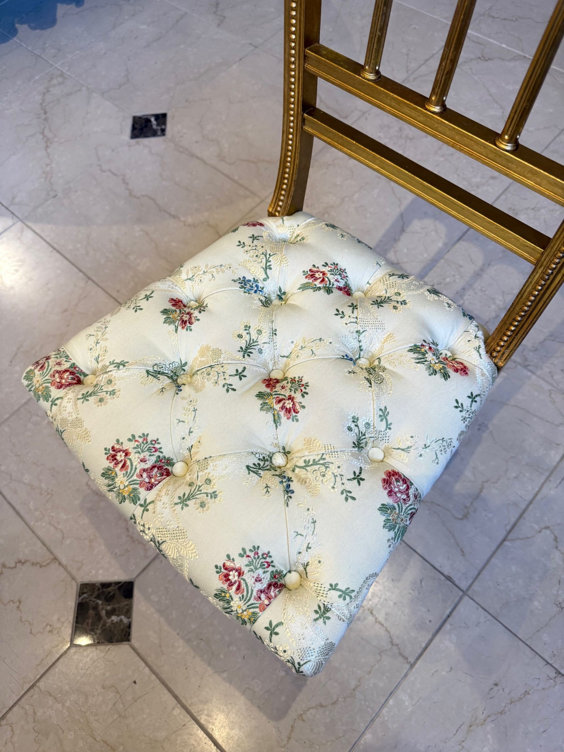 座面は、フランスで買い付けたシノワテイストのブーケ柄の生地使用し、ボタン打ちで仕上げました✧