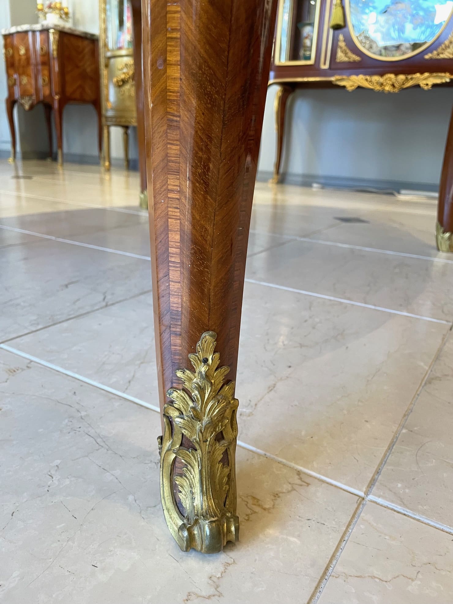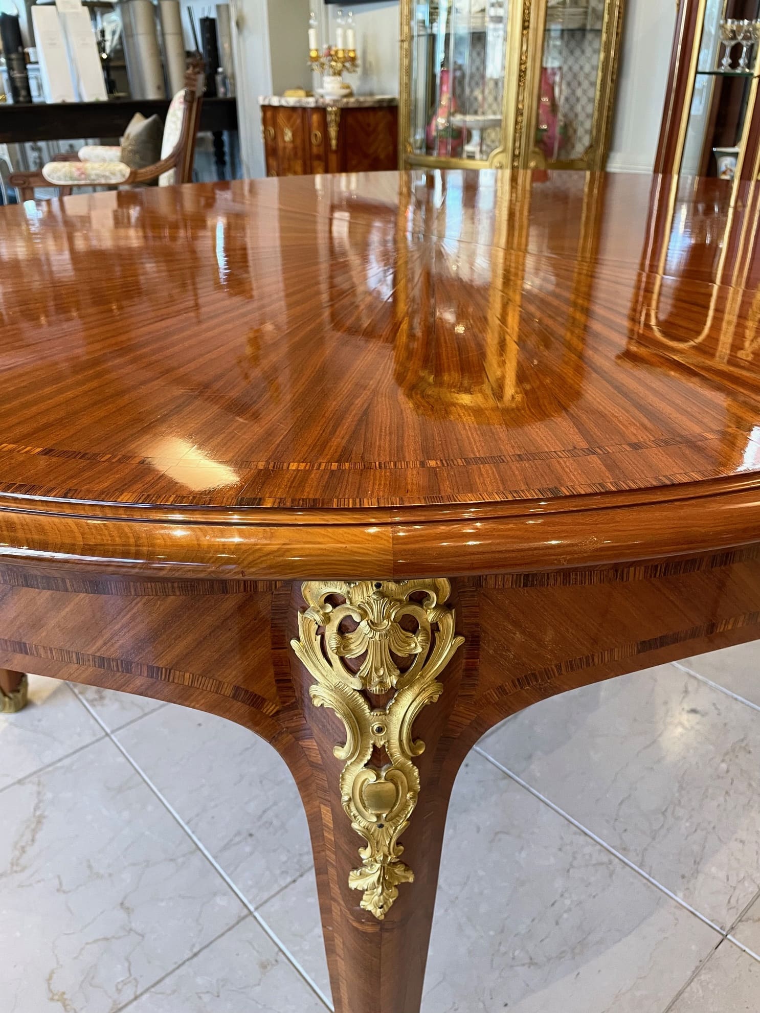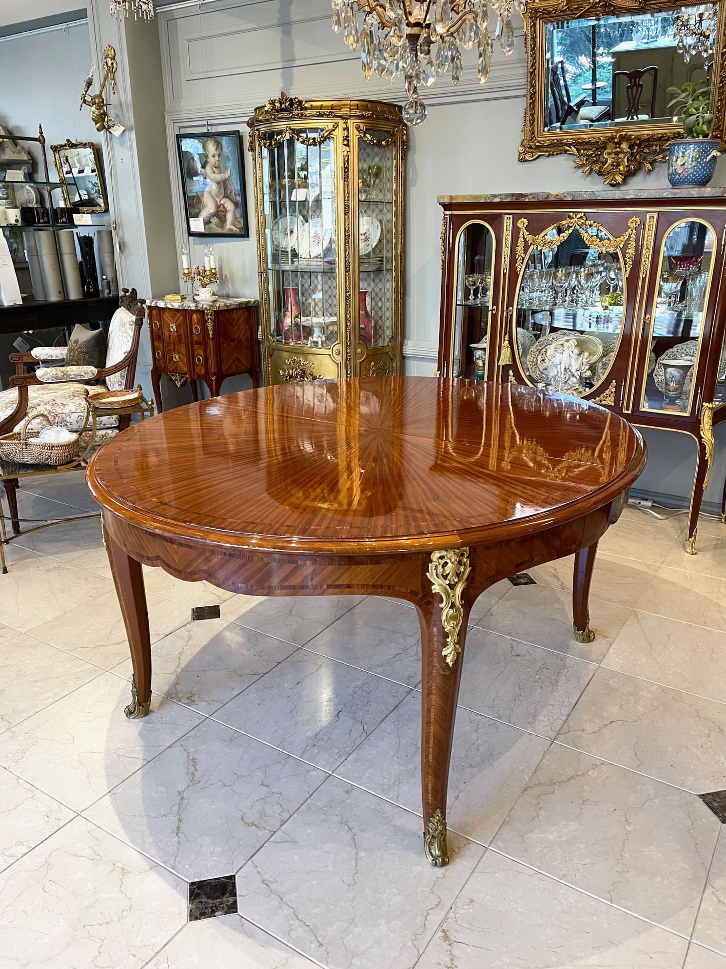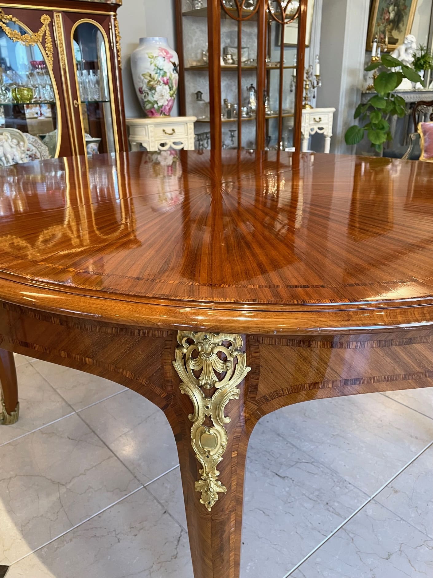キングウッドとローズウッドの象嵌細工が見事な、こちらのルイ15世スタイルのダイニングテーブルも、細部まで手の込んだ職人技が感じられます。