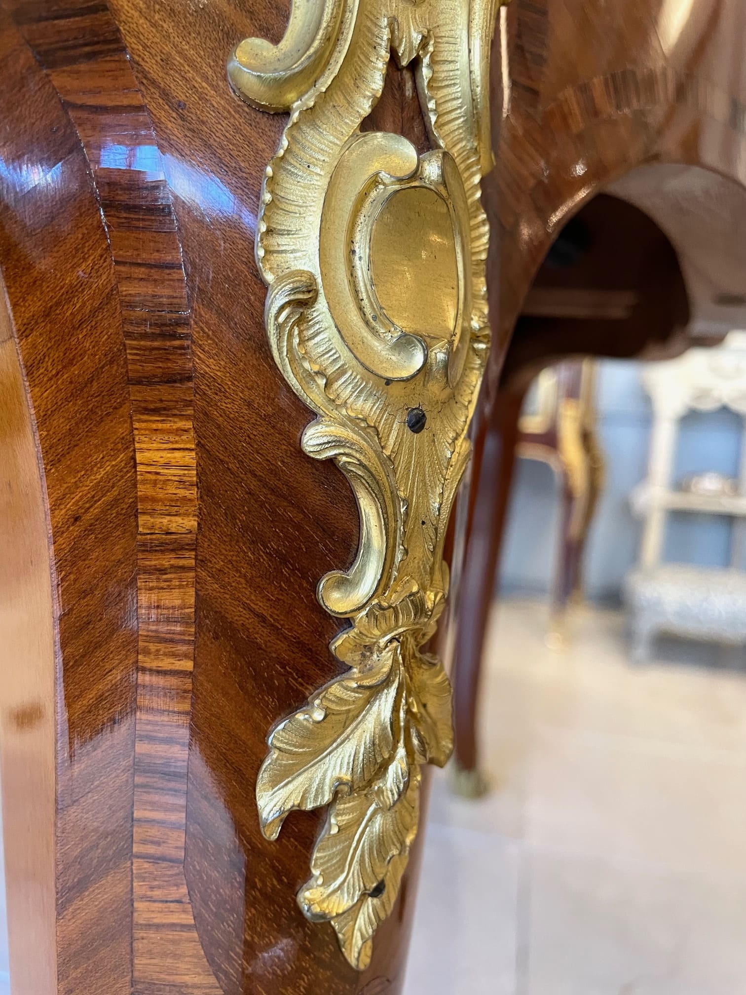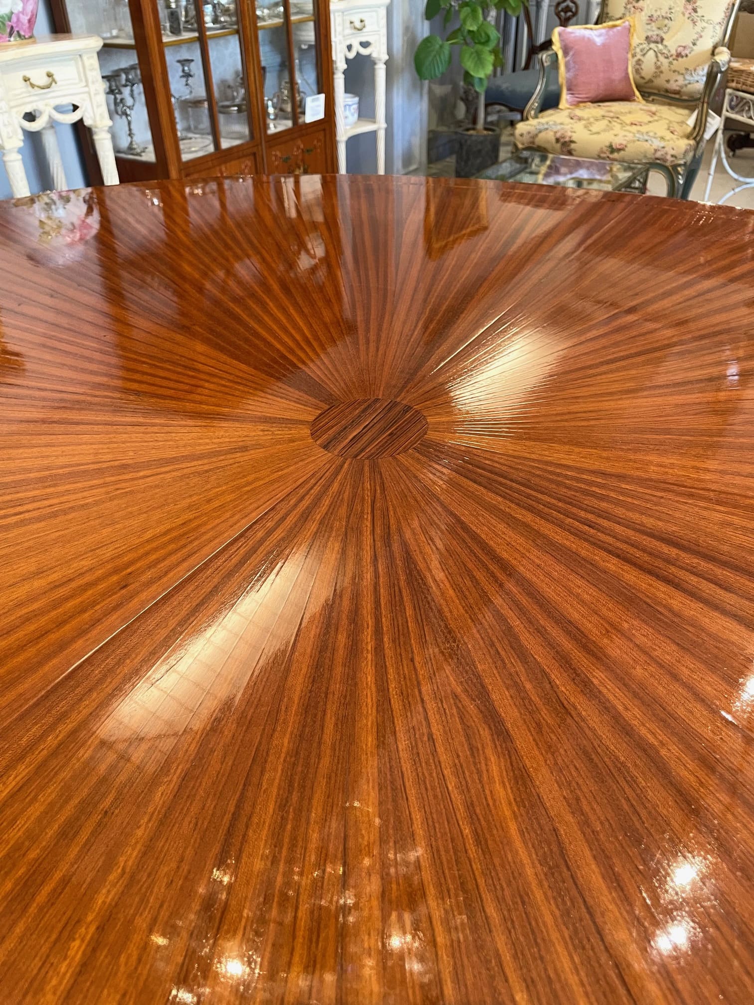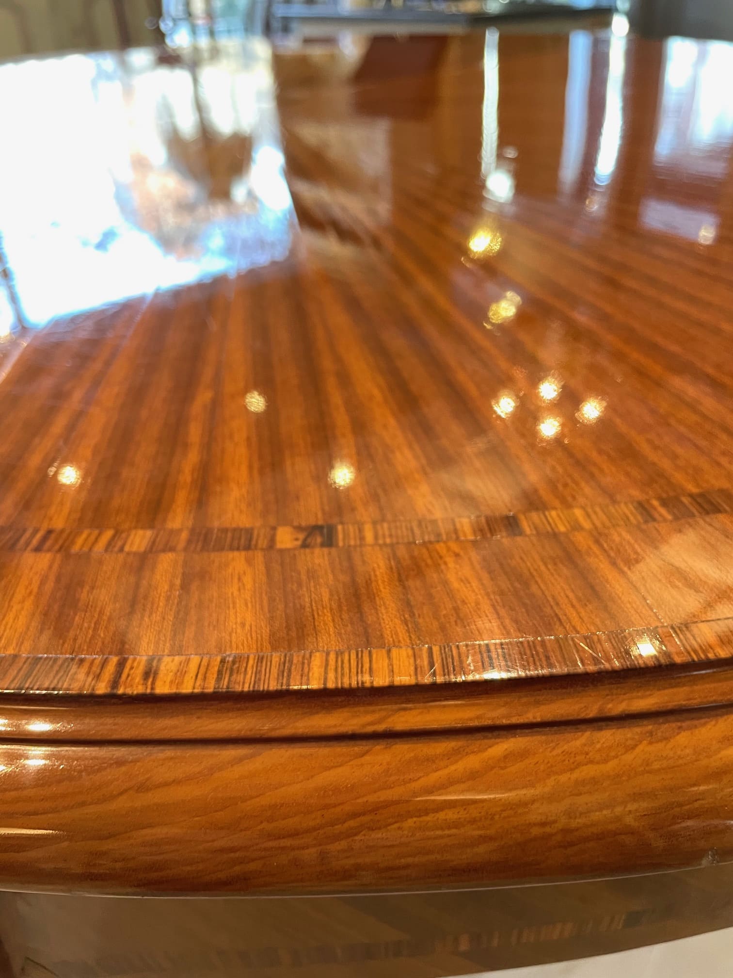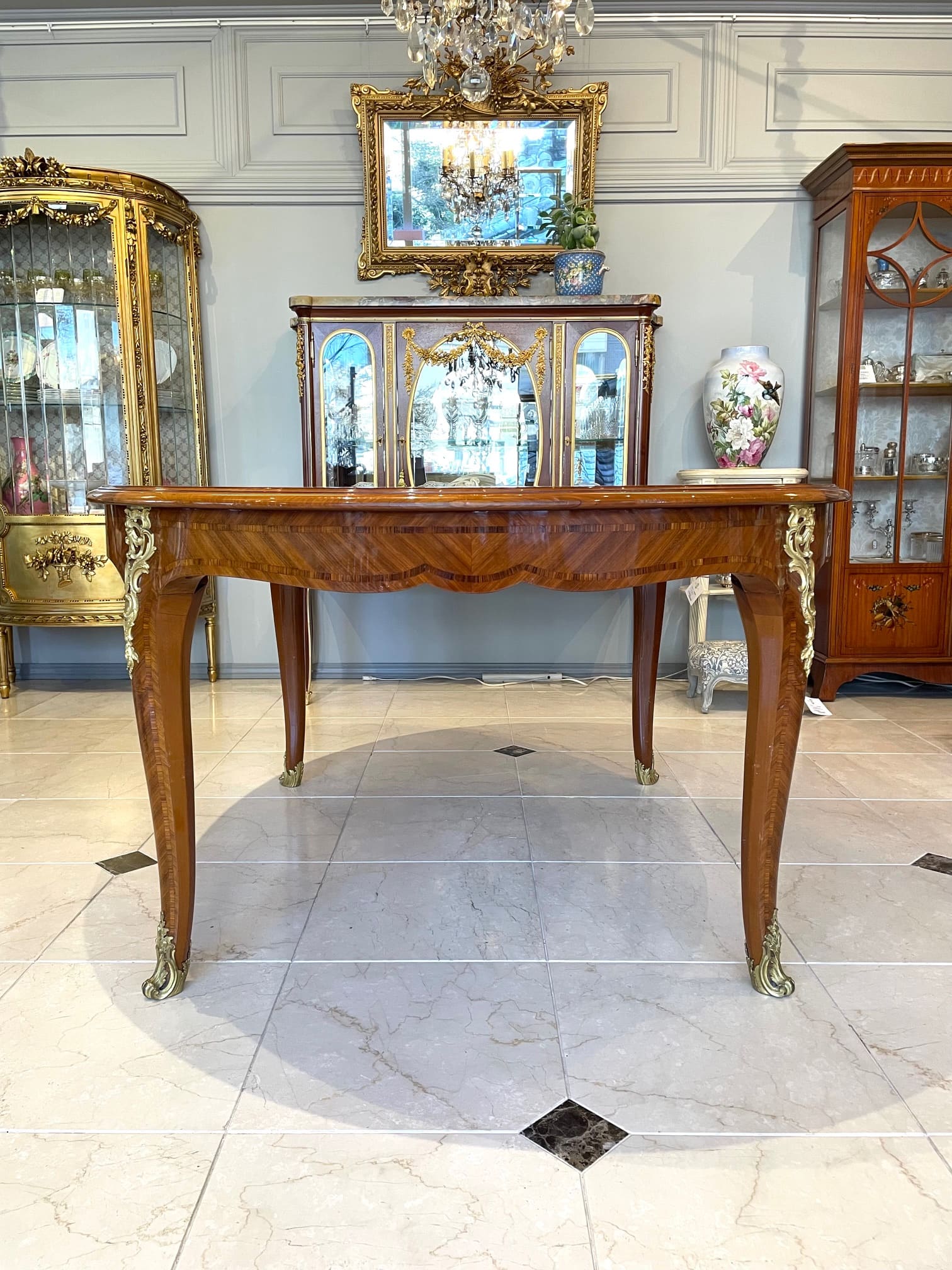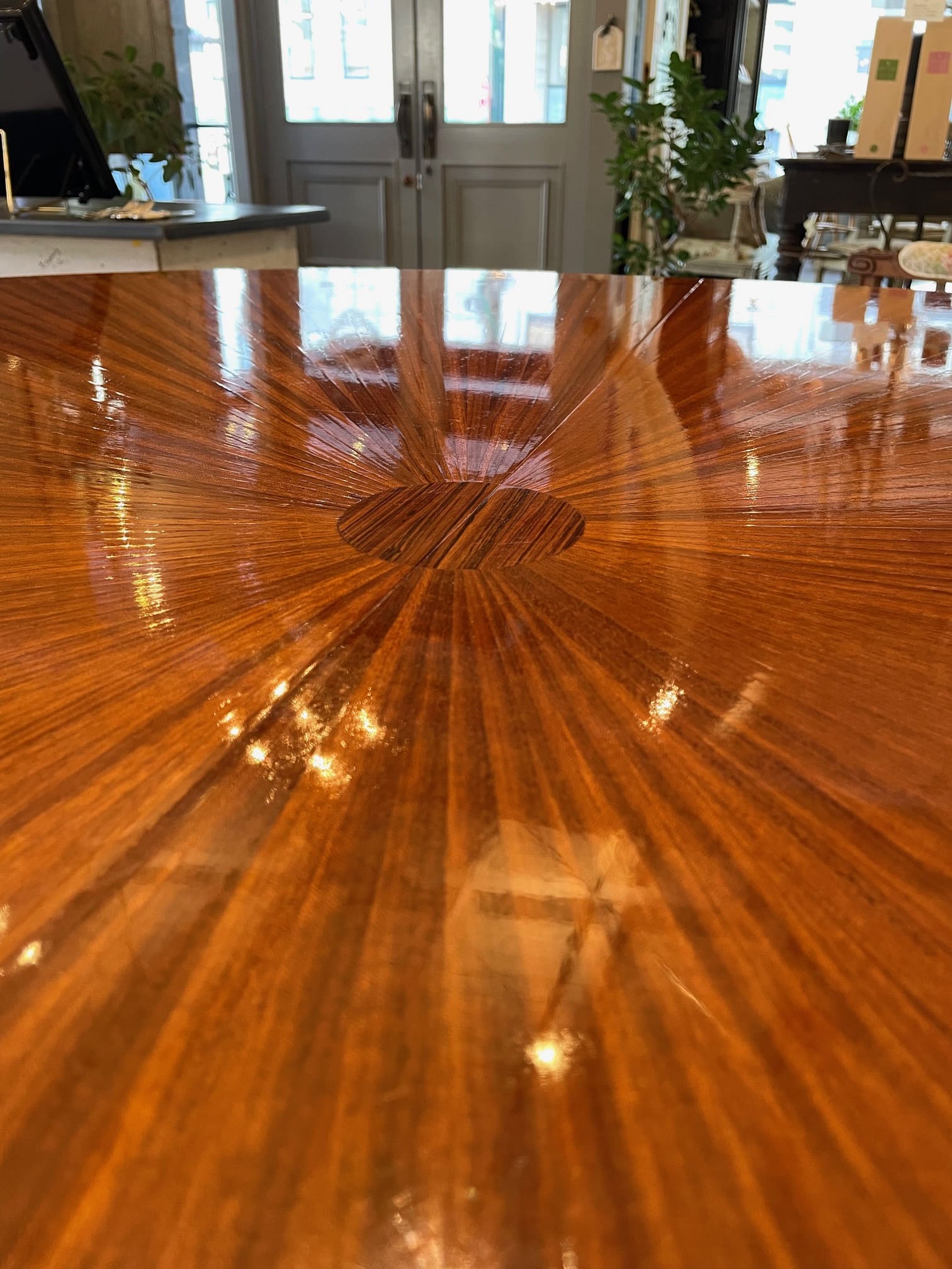 キングウッドとローズウッドの象嵌細工が見事な、こちらのルイ15世スタイルのダイニングテーブルも、細部まで手の込んだ職人技が感じられます。