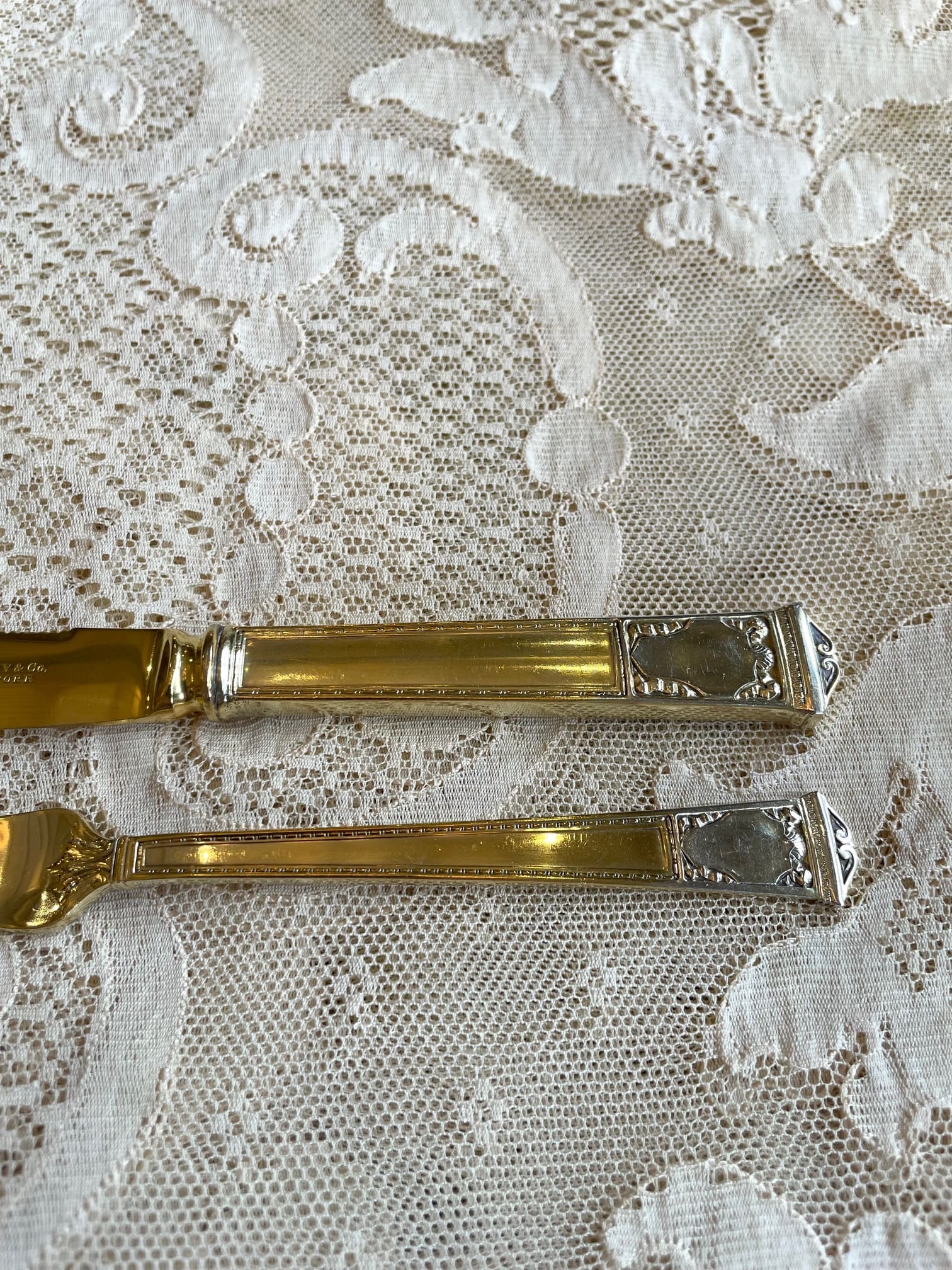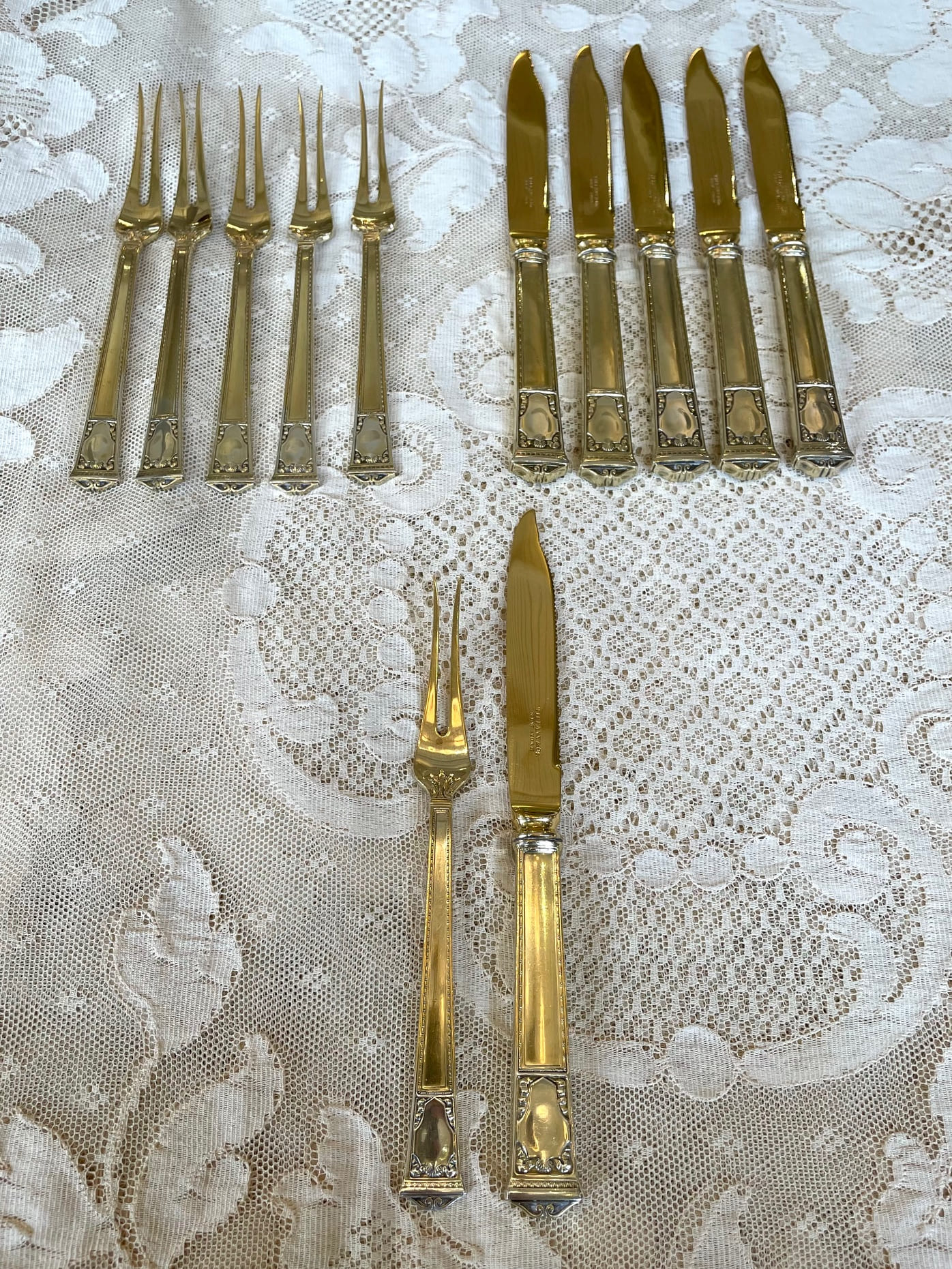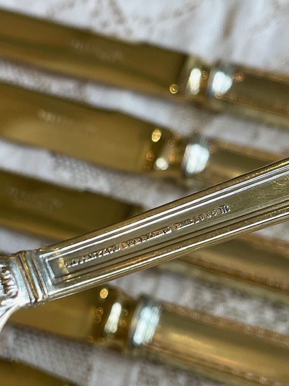 こちらのスターリングシルバーにヴェルメイユが施されたカトラリーセットは