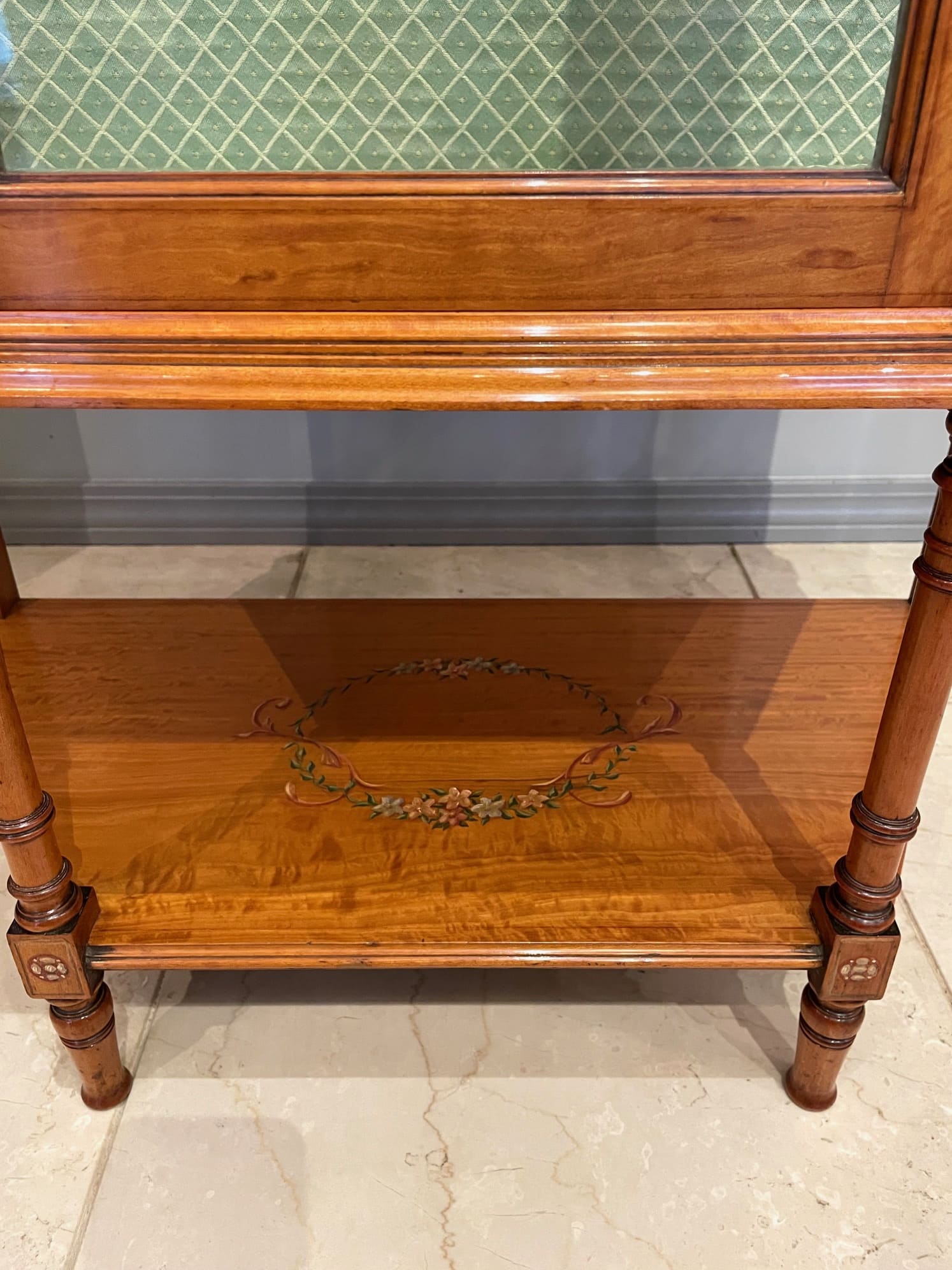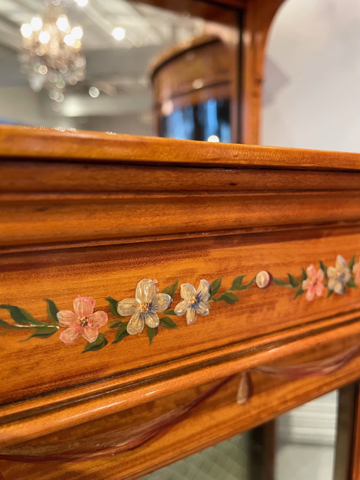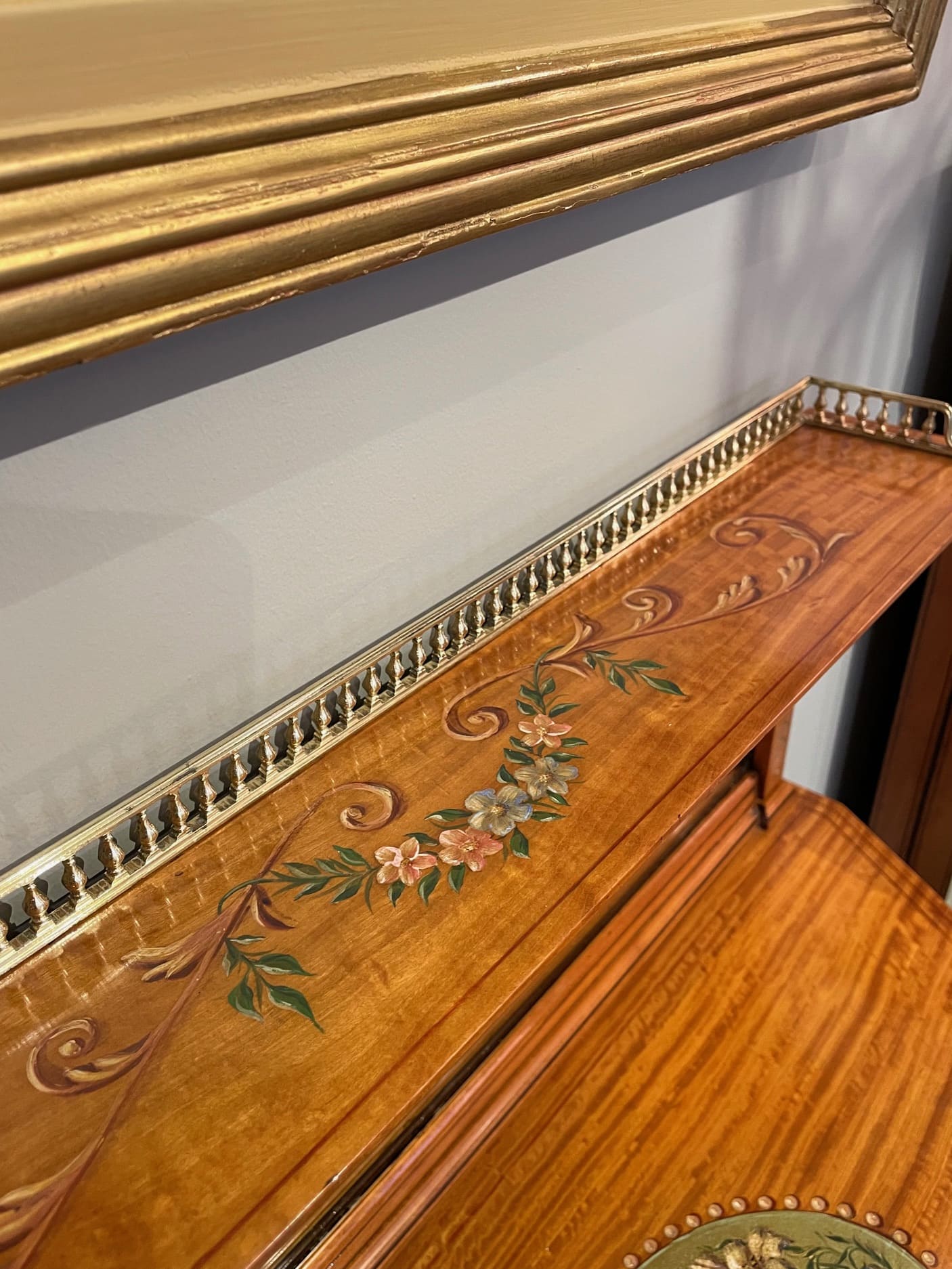 お色味の明るいサテンウッドの家具は、ハンドペイントやマルケトリーが映える為、そのような装飾を施されたお品物が多くみられます。