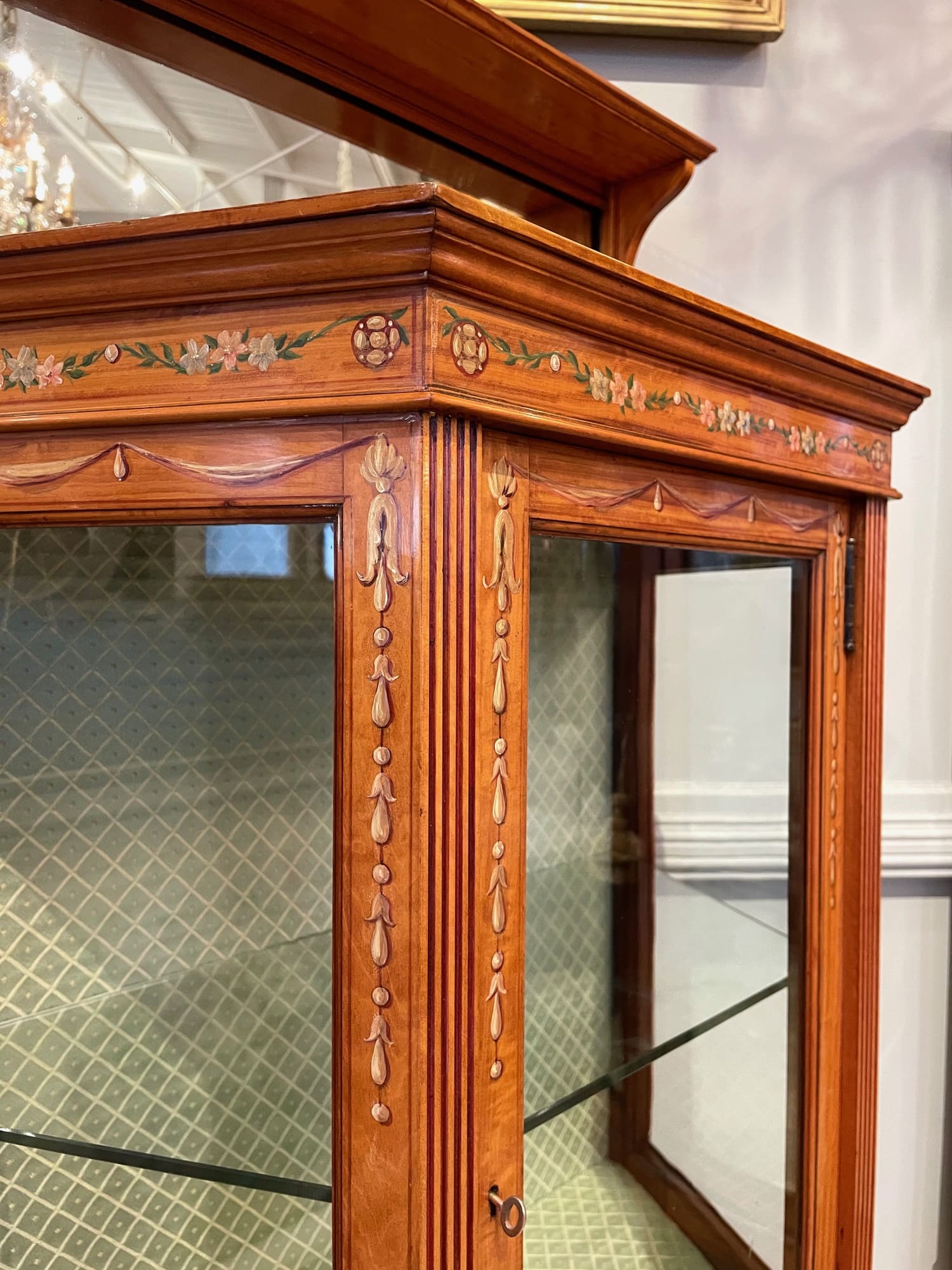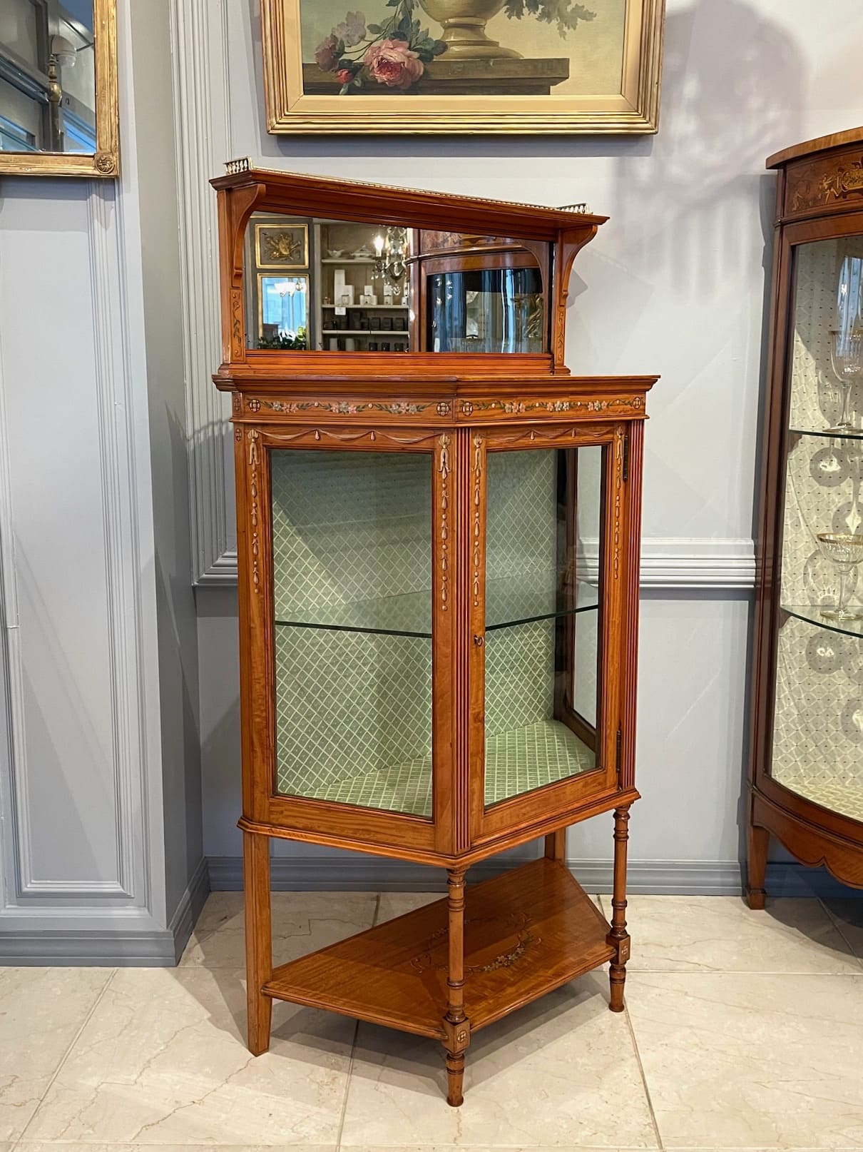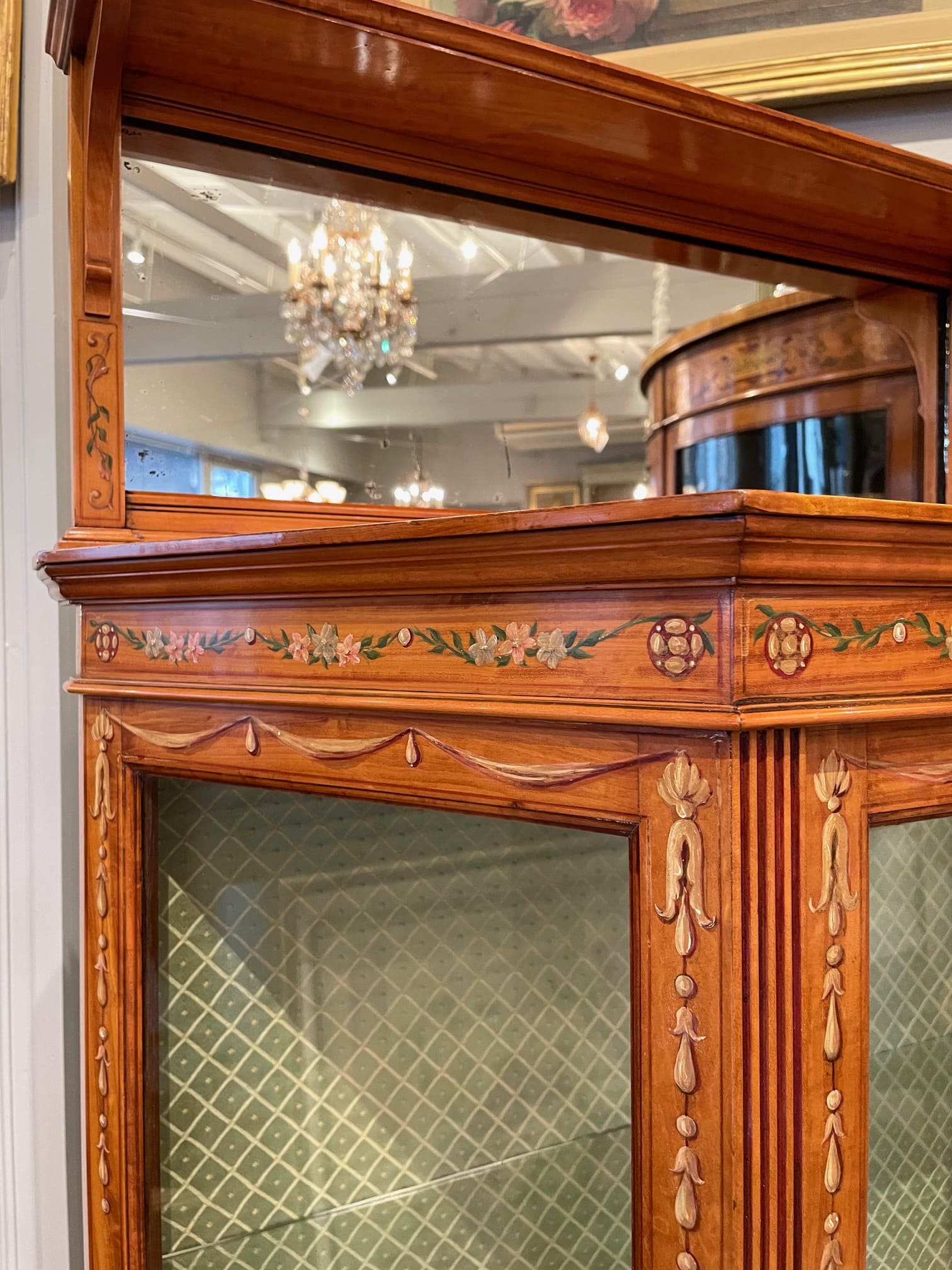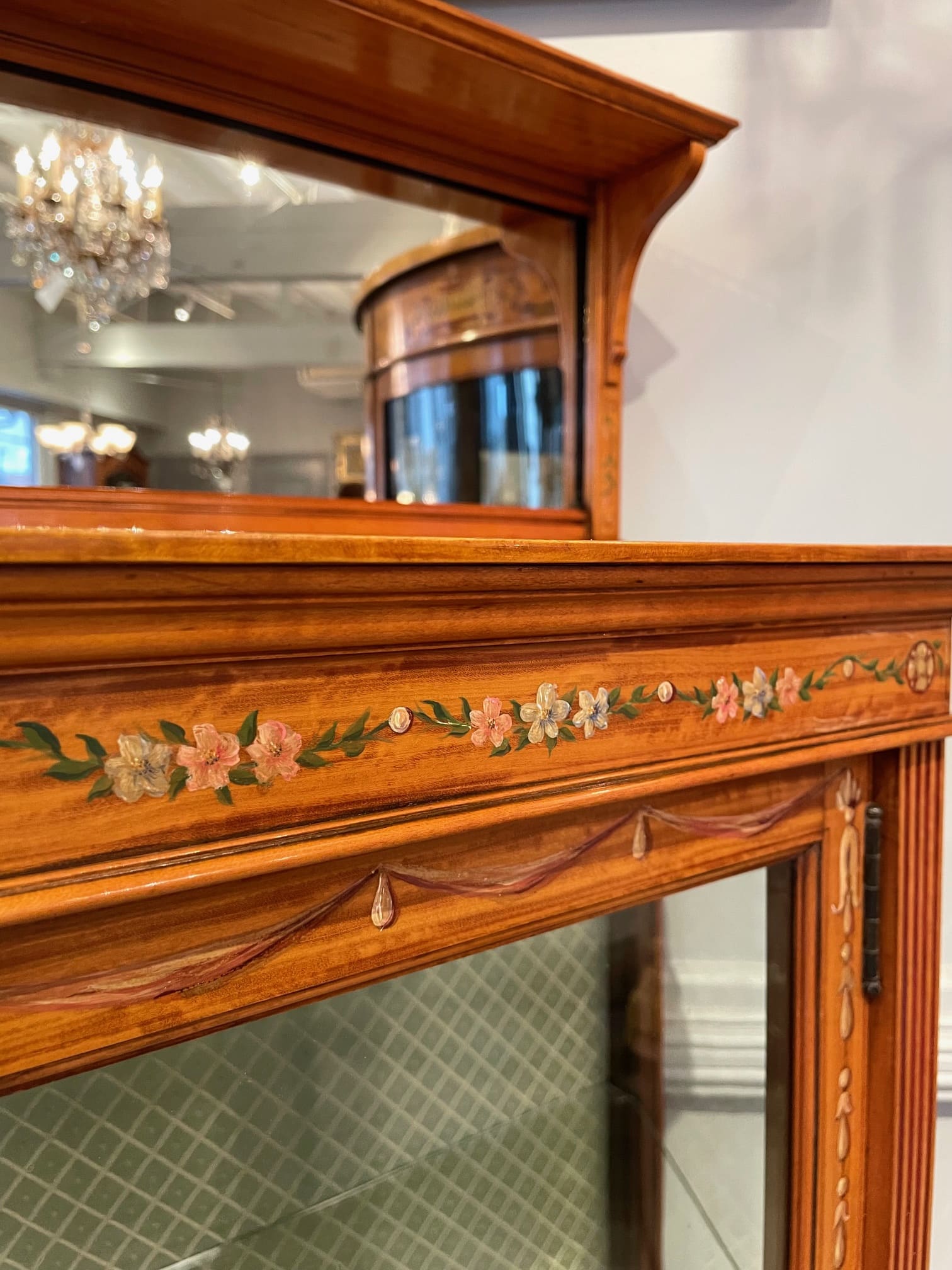 お色味の明るいサテンウッドの家具は、ハンドペイントやマルケトリーが映える為、そのような装飾を施されたお品物が多くみられます。