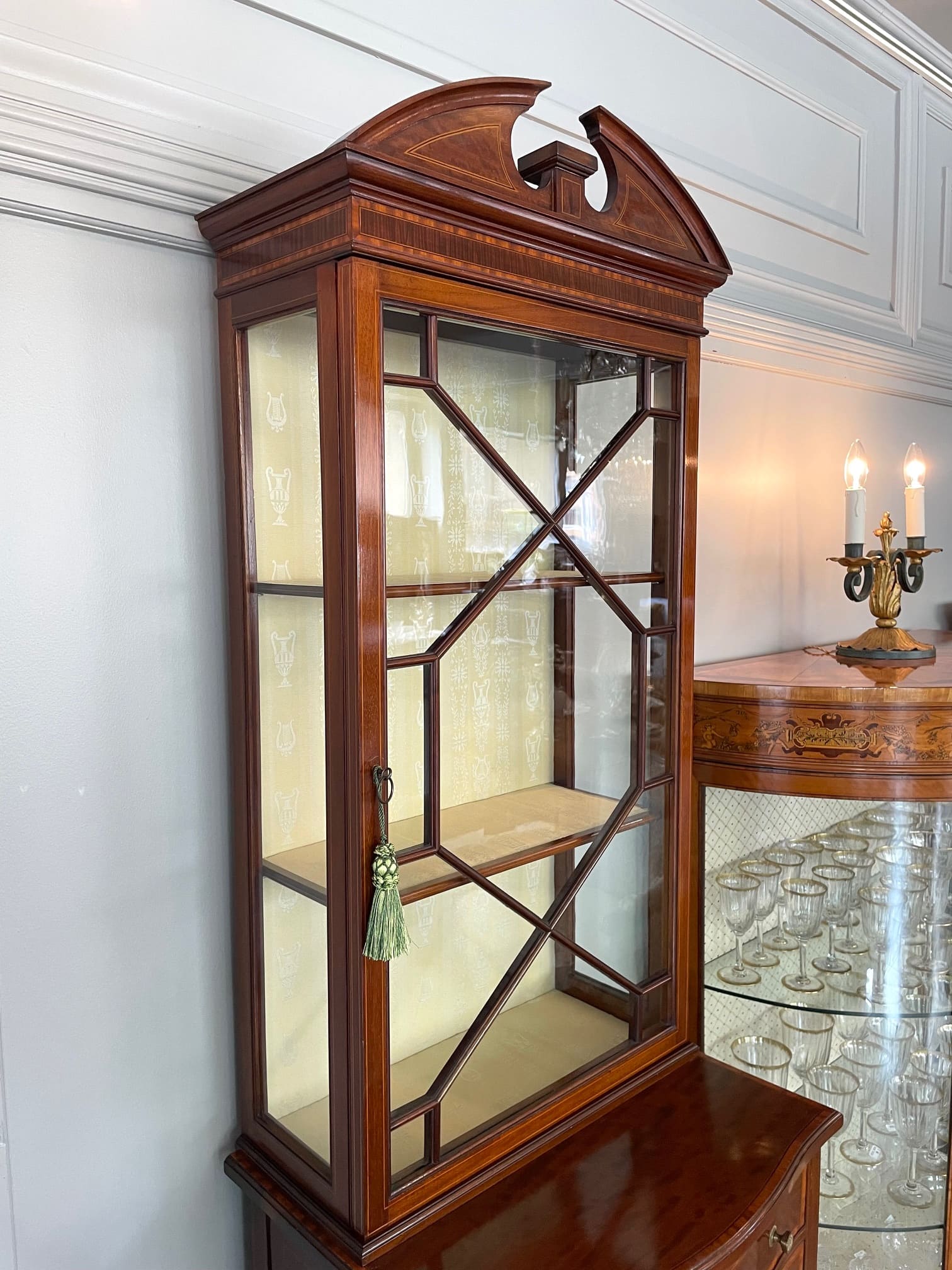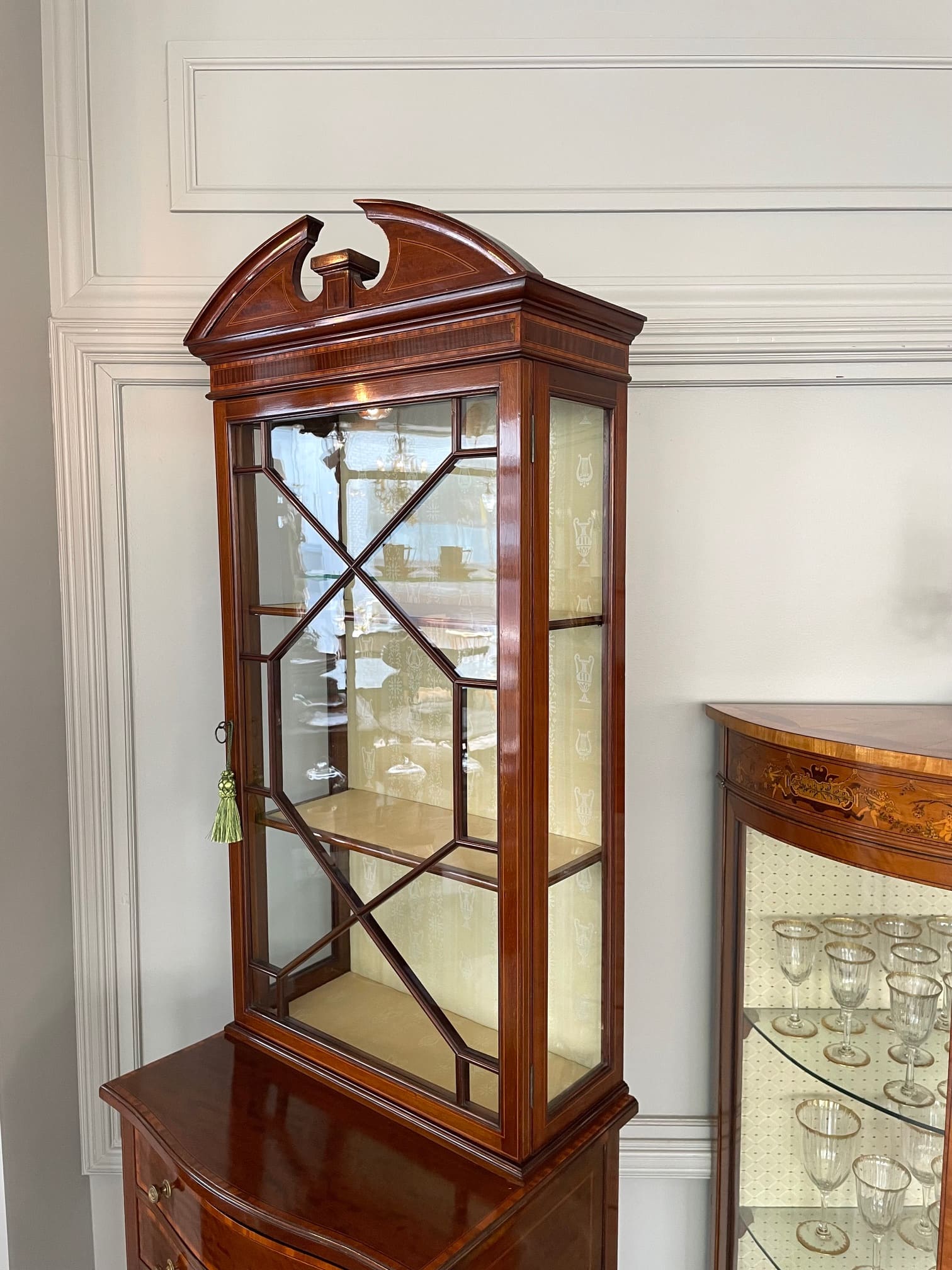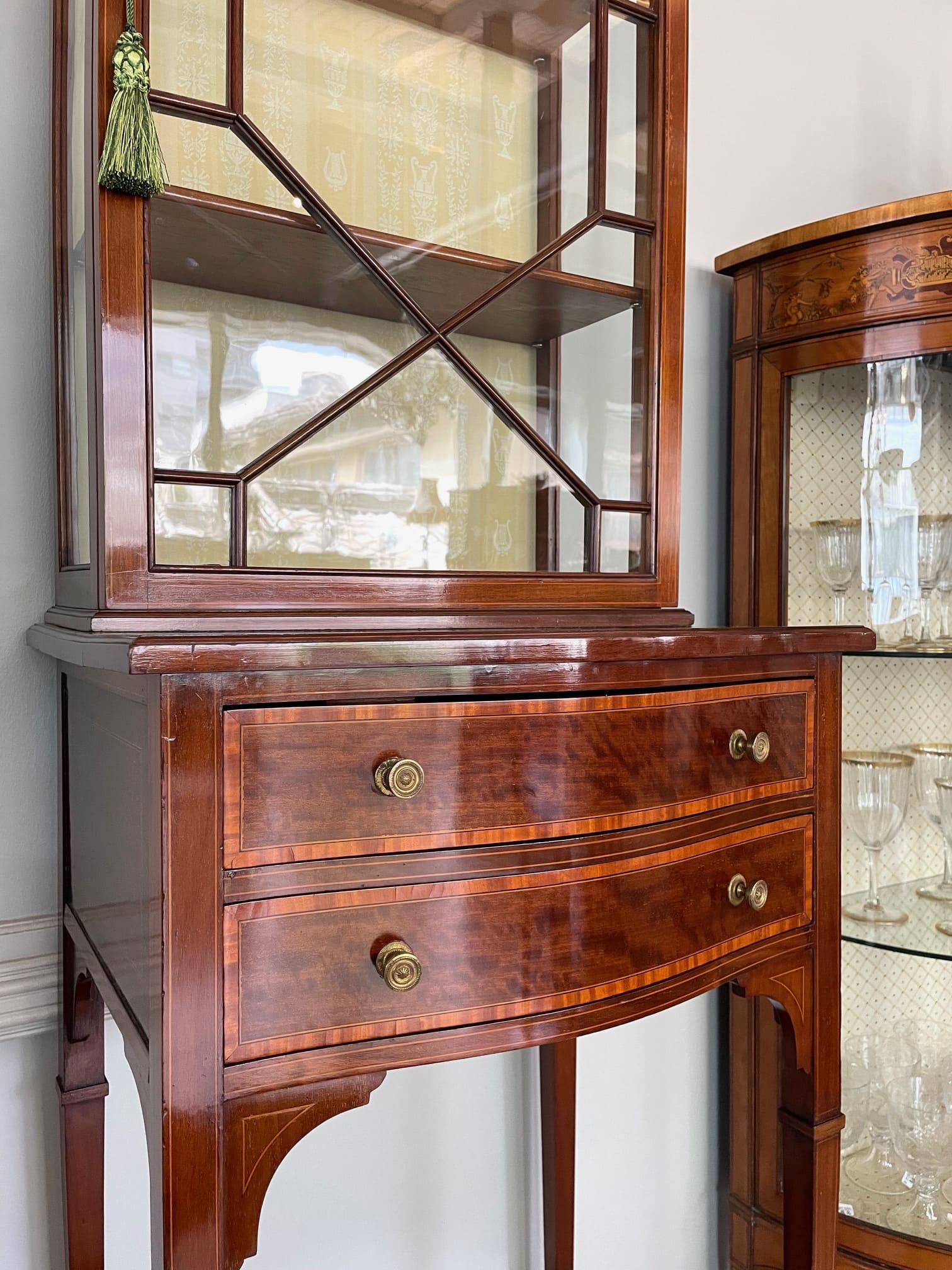 高級木材、天然のマホガニーを主材とし、サテンウッドやエボニーのマルケトリーが映える、すっきりと洗練されたエドワーディアンのキャビネット✧