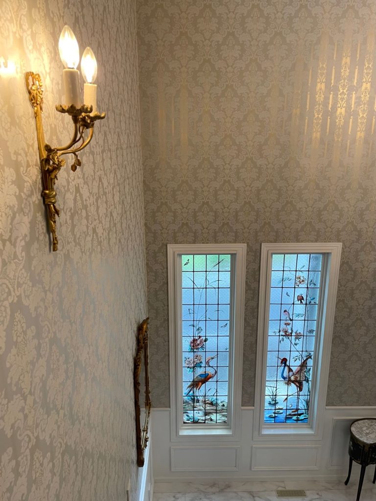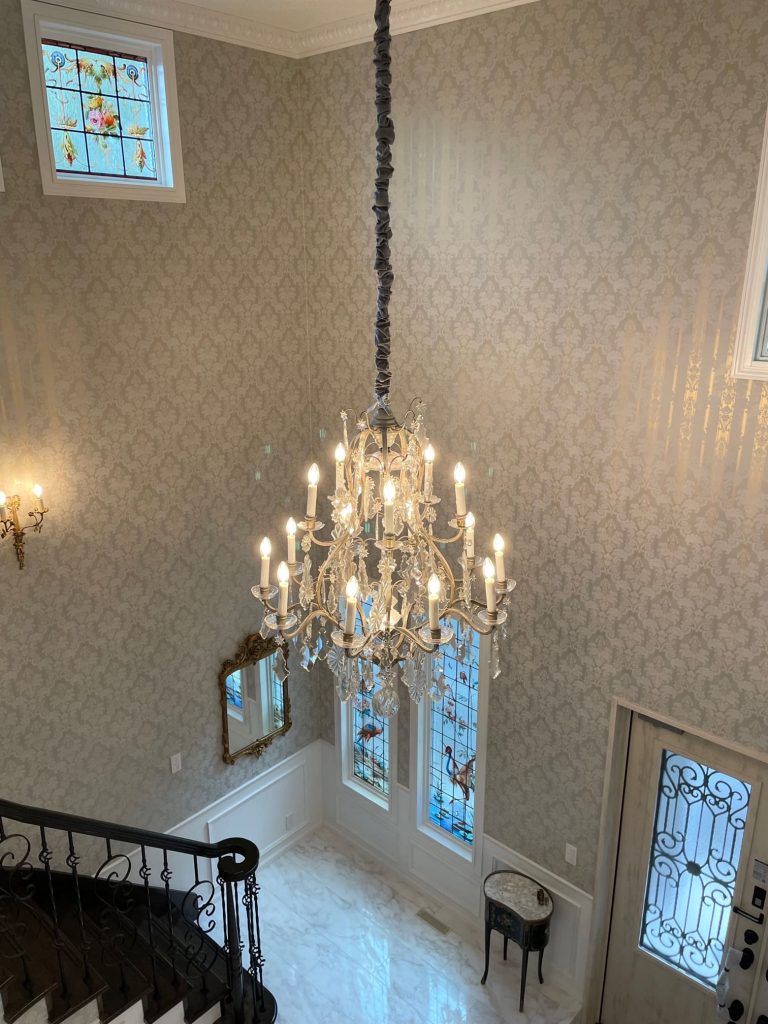 開放感のある吹き抜けのエントランスに輝く大きなオールドバカラのシャンデリアは、リヨンのお城にあったお品物です.*